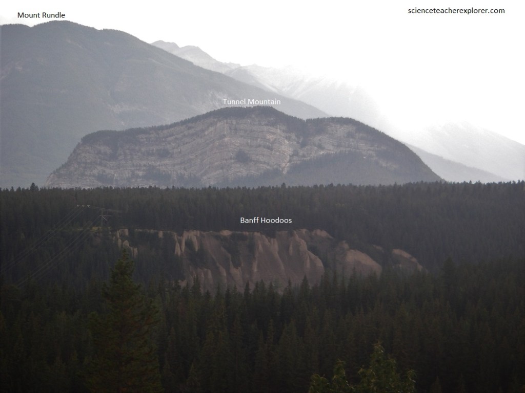 Pictured below, the Banff Hoodoos are formed of cemented glacial till composed of mud, sand and scattered stones left behind by the glacier that once flowed down the Bow River valley. The Bow River has incised its valley into the till since the Ice Age and now flows below. The broad valley has carved by the Bow before the Ice Age, but was widened and deepened by the scouring action of the Bow Valley glacier. The high mountain peaks were not covered but the low mountains, (Tunnel Mountain), were smoothed and rounded by the ice. The floor of the valley is covered with debris composed of pebbles and rock flour ground up and carried by the ice and left when the ice melted. The edge of the Rundle Range stretches off to the south with knobs and irregular peaks sticking out here and there, looking rather like the edge of a notched board. The rocks in Tunnel Mountain are largely made of the Palliser limestone.