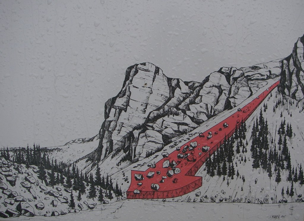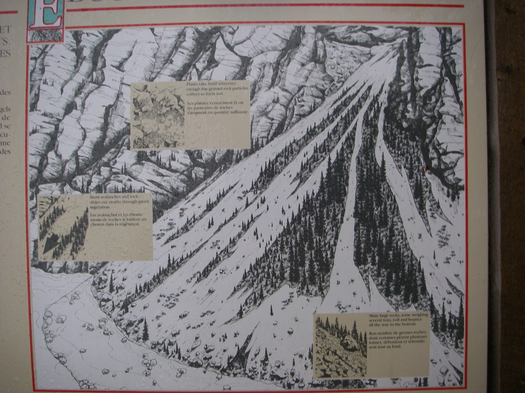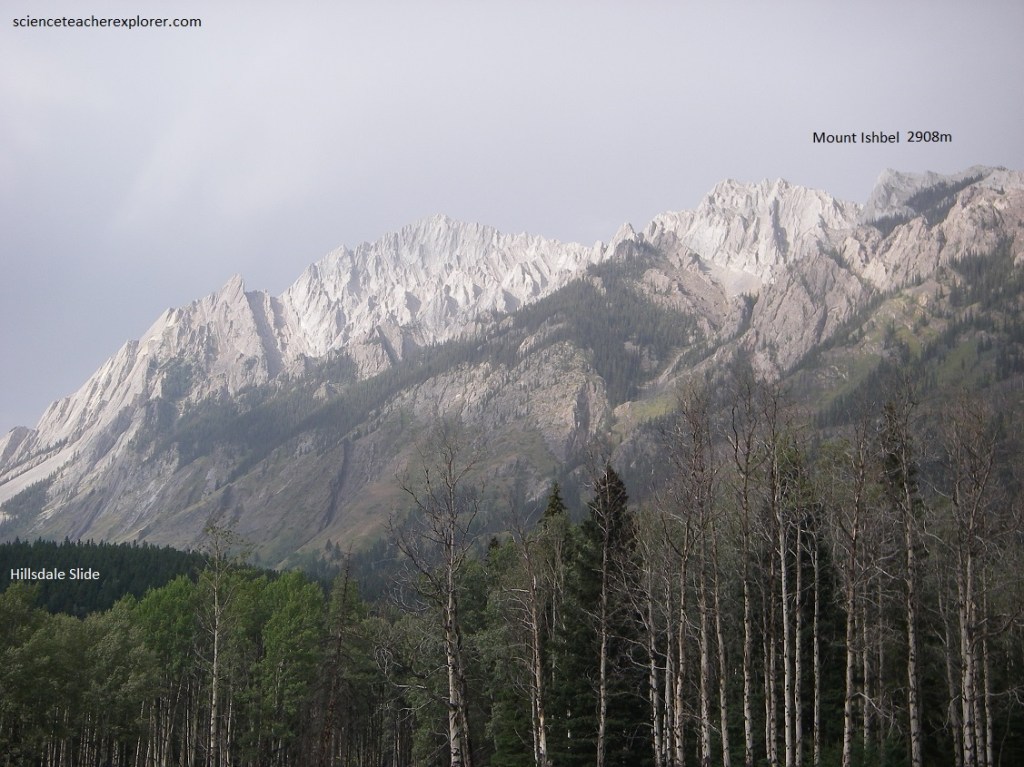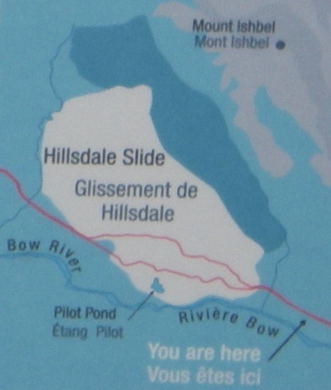 Imaged above, the waste from this slide, (Hillsdale Slide), has added an enormous bulk of broken rock to the scree slope below. Immediately below the slide, the Bow River is busily building and destroying islands of sand and gravel, with the tall straight dark spruce trees standing as mute witnesses of these activities on the valley flat just beyond.