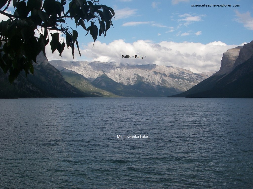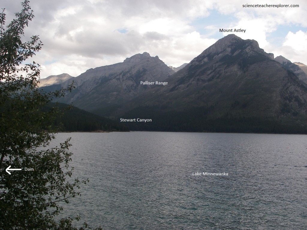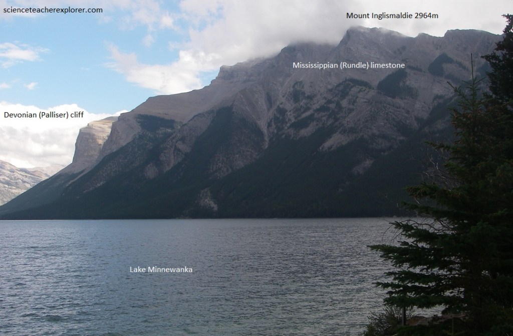 Pictured below, the mountains on either side of Minneanka Lake are a great thrust block of Paleozoic rocks. The Devonian (Palliser) cliff can be seen in the distance on Mount Inglismaldie and is overlain by Mississippian brown shales followed upwards by the grey limestones (Rundle) that form the peak. Warm brown rocks of the Rocky Mountain formation (Pennsylvanian and Permian) and the Triassic slope westwards off the top of Mount Inglismaldie and are exposed along the road at the end of the lake, and immediately below the dam.