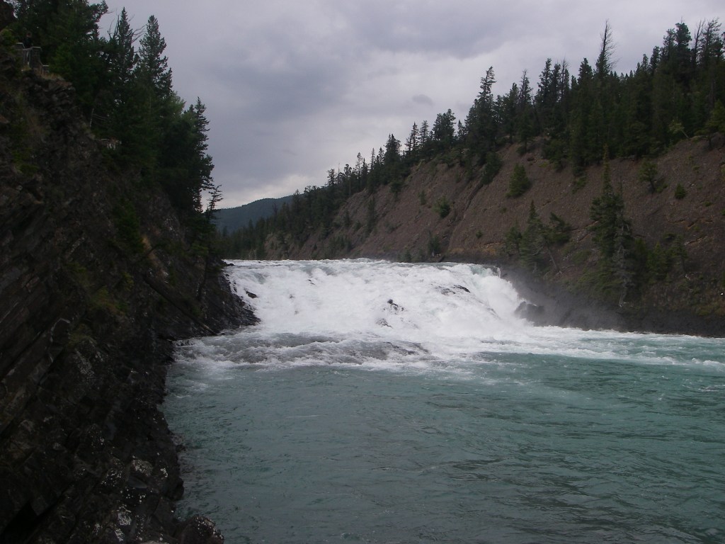Pictured above, looking upstream, the rocks on the right are of Paleozoic age, (between 240 million and 600 million years old). They form the uppermost part of a sequence that includes both Mount Rundle and Tunnel Mountain. The rocks on the left, on the other hand, are of the more recent Mesozoic era and belong to the Spray River Group, having been formed or laid down in the Triassic period, about 200 million years ago. The Bow River flows along the contact between rock groups of different ages. The fact that it takes this course is no accident, because along such contacts the rocks are often more easily eroded than elsewhere. At one time the Bow Falls were probably very much higher than they are now.
