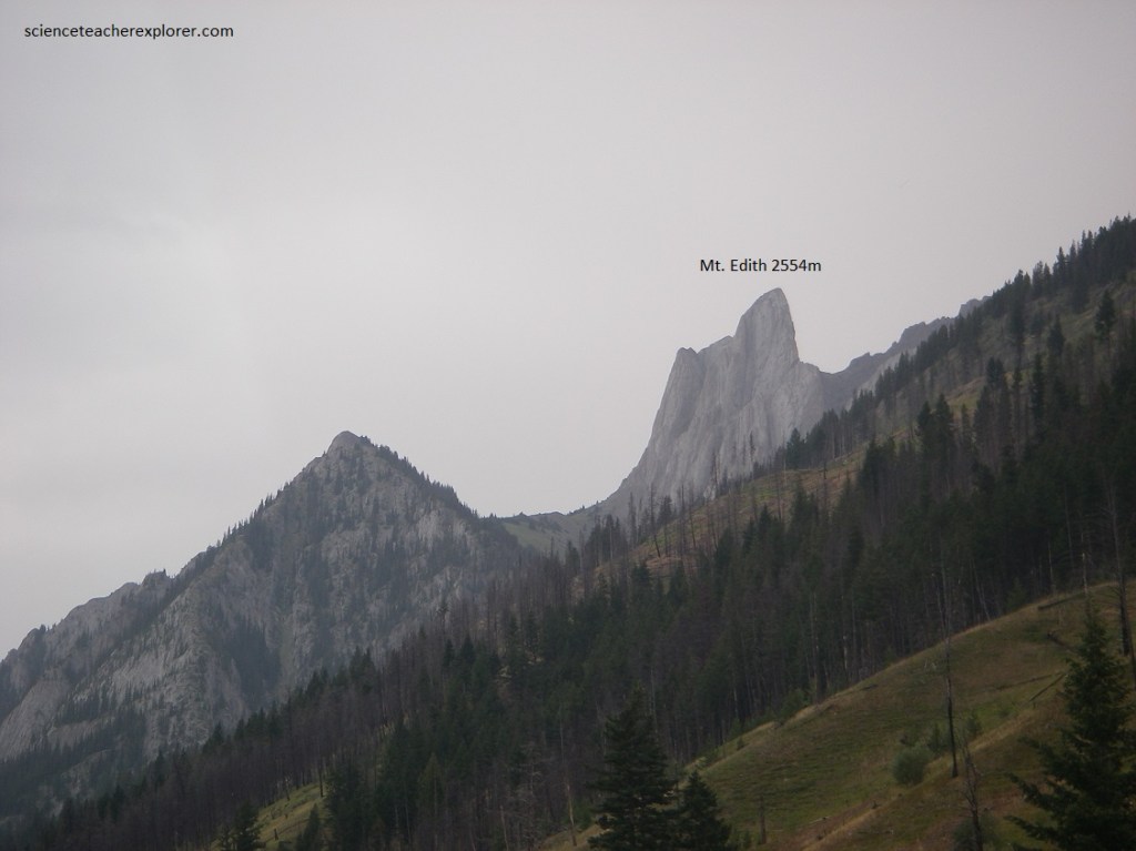 Pictured above, the vertical ribs of Mount Edith (Palliser limestone) are visible up a valley to the north, with the grey limestone of Mount Norquay to the northeast, from the intersection of the Tran-Canada Highway and Route 1A (Bow Valley Parkway). The first ridges that the Bow River cuts through in its eastward course include these vertical ribs of the Sawback Range. Sharp, jagged mountains sometimes result from the erosion of masses of vertical or nearly vertical rocks. The peaks may be centered on a bed of particularly resistant rock, in which case a tall spine or rock wall may result. Mount Edith is s spectacular example.