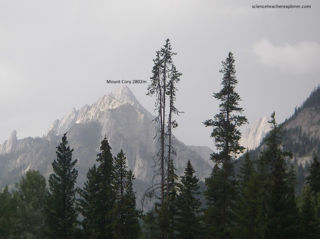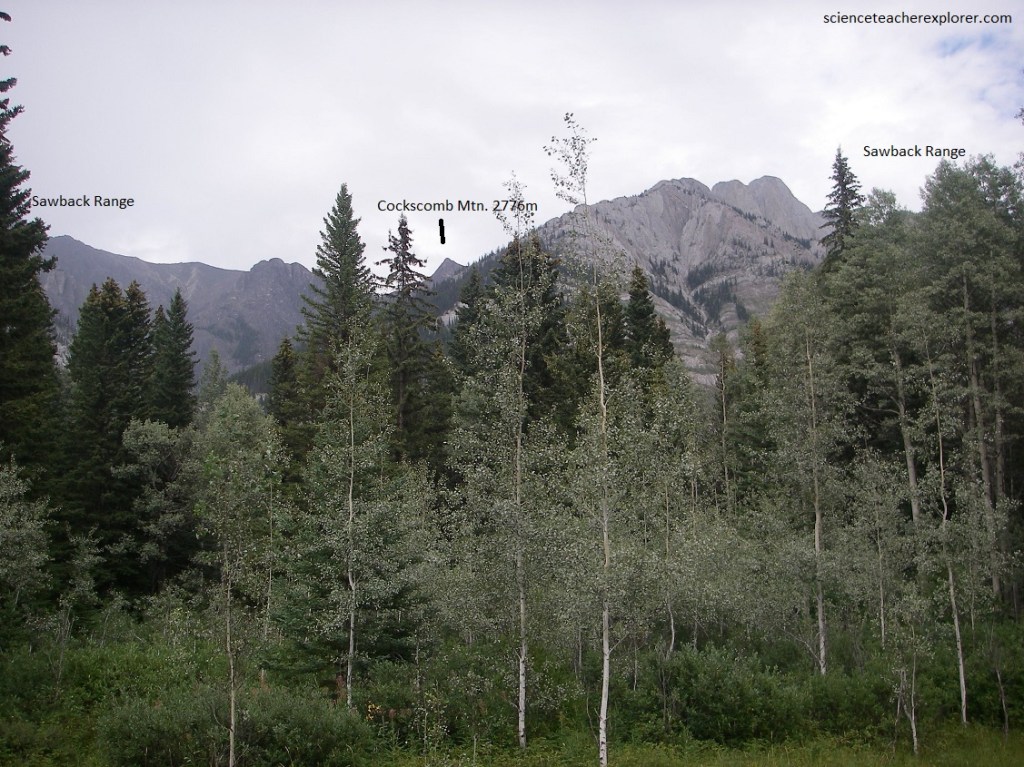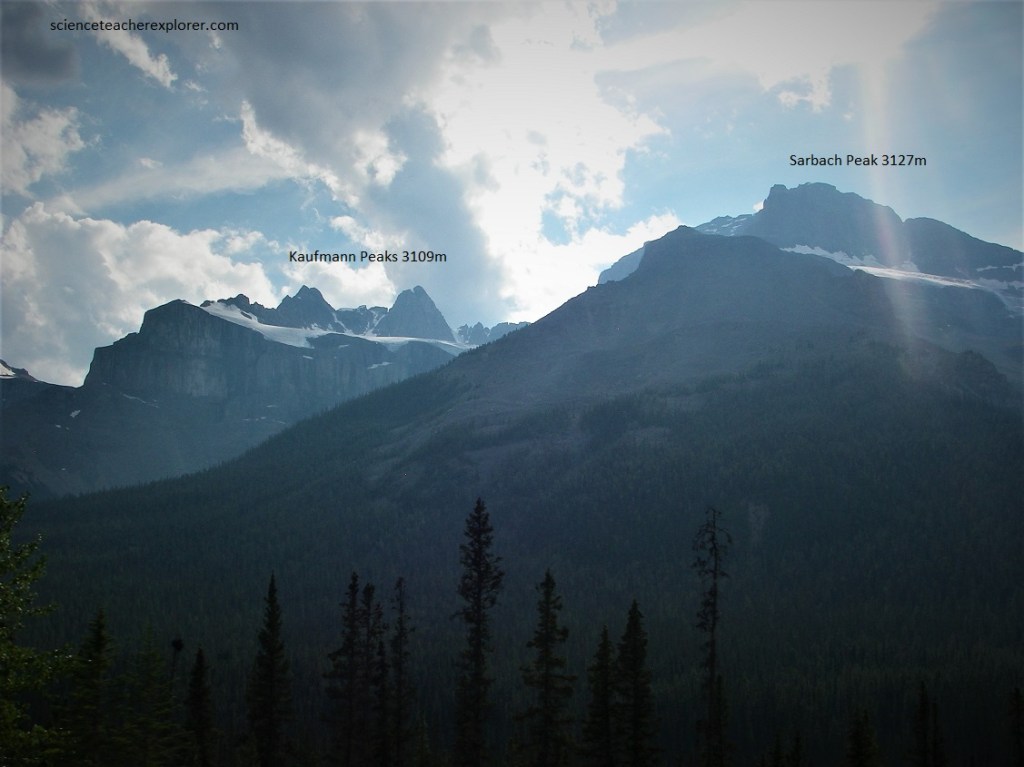 Pictured above, behind and up the hill, the great limestone walls of the Kaufmann Peaks end to the right in Mount Sarbach, with several lovely glaciers hanging on the upper slopes. Mount Sarbach is the “type locality” for some of the Ordovician rocks of Banff National Park, with its lower slopes in Upper Cambrian rocks.
