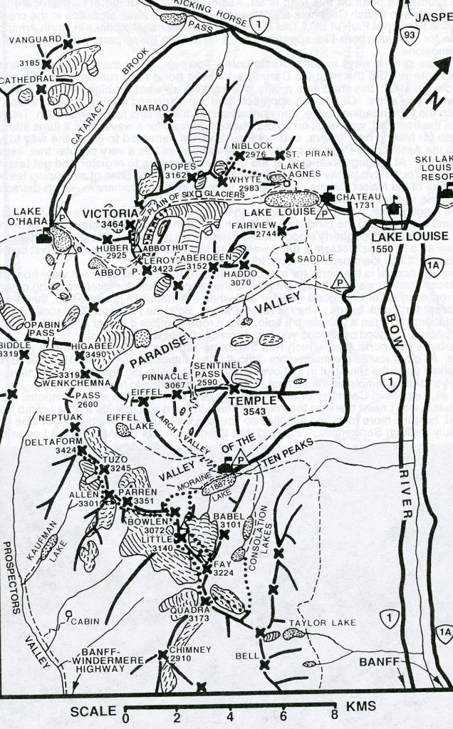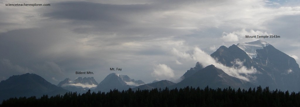 Becky and I continued onto the village of Lake Louise next to the Trans-Canada Highway. Pictured above, to the southwest of the junction, Mount Temple thrusts its peak into the sky and shows on its northeastward slope a dazzling white glacier. Farther to the right, assorted peaks with ice and snow occupy the skyline in the general direction of Moraine Lake, (our next destination). Mount Fay shows a patch of snow on its right flank and Bident Mountain (Quadra) shows one isolated peak, the a long flat but serrated skyline with snow below the serrate shoulders.