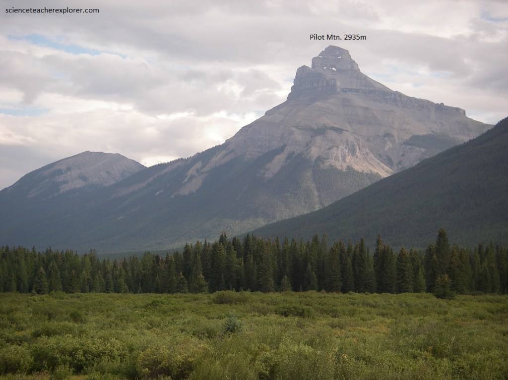 Pictured above, across the Bow River valley Pilot Mountain’s wooded lower slopes give way upwards to it bare peak. The layered snowy knob of Pilot Mountain continues to be the landmark that it is for many kilometers up and down the Bow River valley.