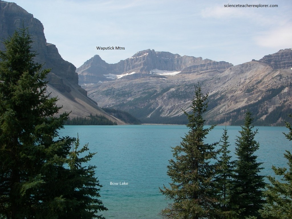 Pictured above and below, almost all the rocks in the area are quartzites of Lower Cambrian age that have a general pinkish or brownish tinge, with later Cambrian grey limestones in the higher peaks such as the one beyond Crowfoot Glacier. Southwestward, Bow Peak stands up in a pointed mass that contrasts in shape with the “long look” seen in the mountains on both sides of the Bow valley.