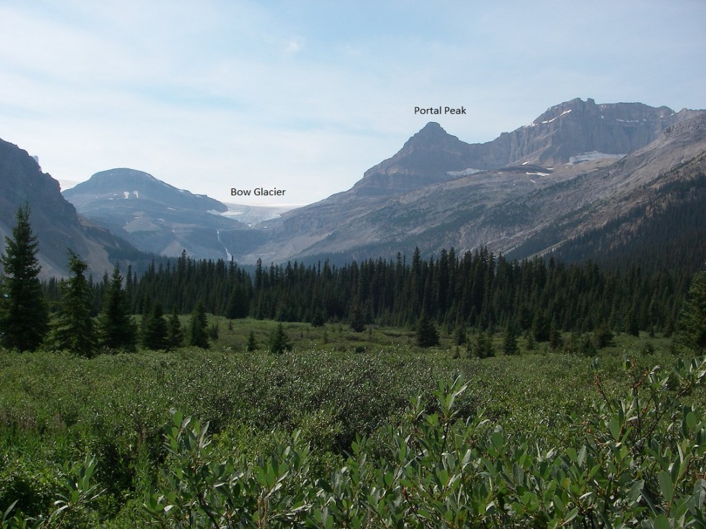 Pictured below, across and up the northern arm of Bow Lake, we can see part of a very large snowfield that covers the area of the Continental Divide here form many kilometers. At this point it sends one icy tongue, (Bow Glacier), over the cliffs, showing a rather spectacular icefall before it disappears behind the intervening lip of rock. Behind the lip lies a small meltwater lake whose outlet tumbles over the cliffs and ledges to from the curtain of whit water visible from the highway. Below this again the meltwater brook is bringing down a mass of glacial debris to build a considerable delta into the west arm of Bow Lake. Portal Peak to the right of Bow Glacier has irregular patches of ice and snow scattered along its bulk.