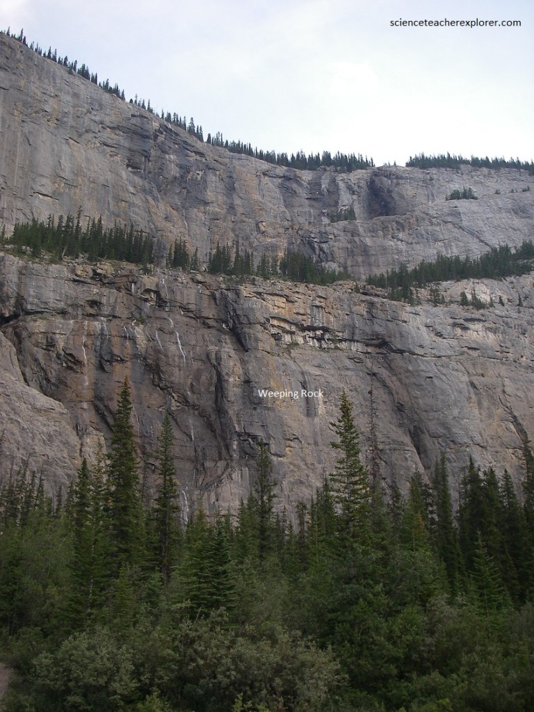 Pictured above, Johnston canyon cuts across the trend of the mountain ridges it drops through several canyons and waterfalls that provide many beautiful views. A short walk up the creek from the parking lot along and easy boardwalk takes us to some of the nearer of these features. This canyon is cut into the steep cliffs of Mississippian rock, made up of massive beds of limestone containing an abundance of fossil shell and fragments.
