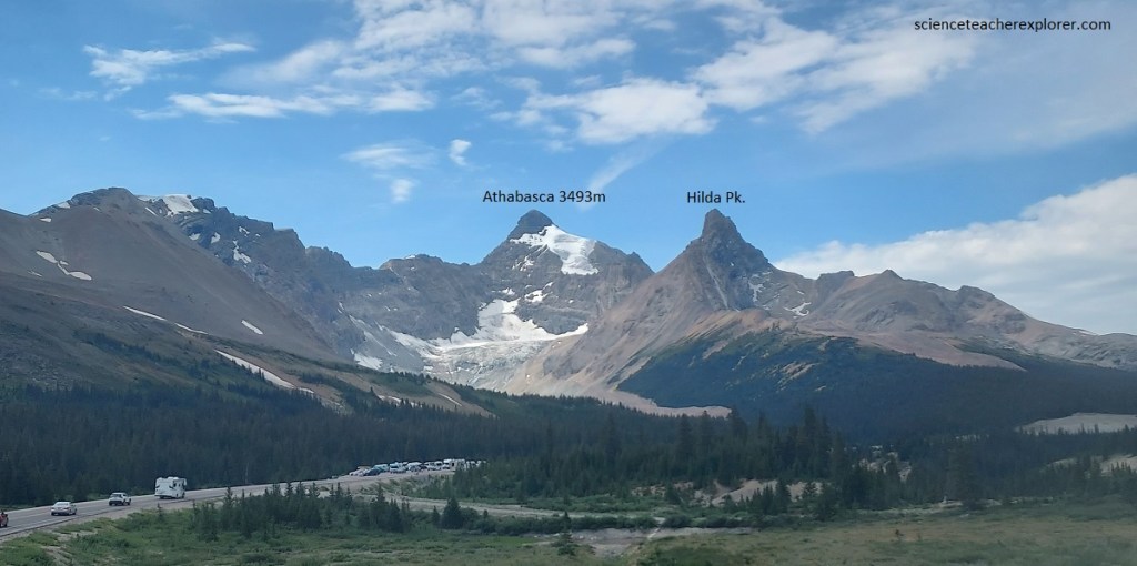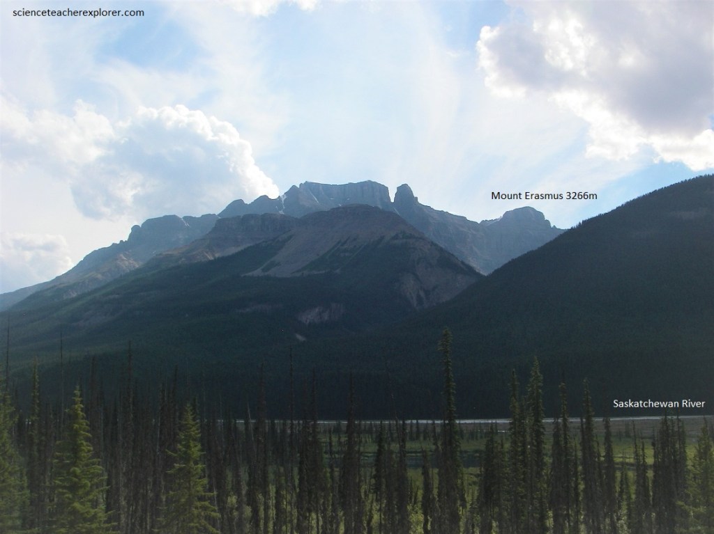 Pictured above, the peaks of Mount Erasmus are composed largely of Upper Cambrian and Ordovician rocks. From the Saskatchewan River Crossing the Banff-Jasper Hwy. follows North Saskatchewan River valley, a deep valley, U-shaped but narrower than the valleys of the Mistaya and Bow rivers to the south. It, like the latter, also carried a glacier during the Ice Age.