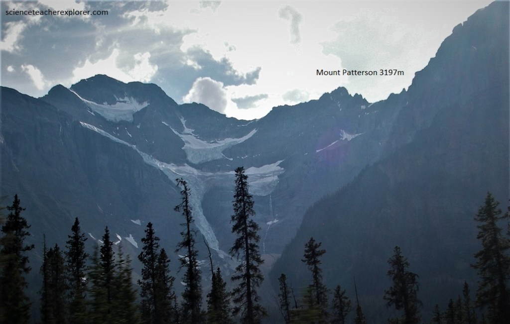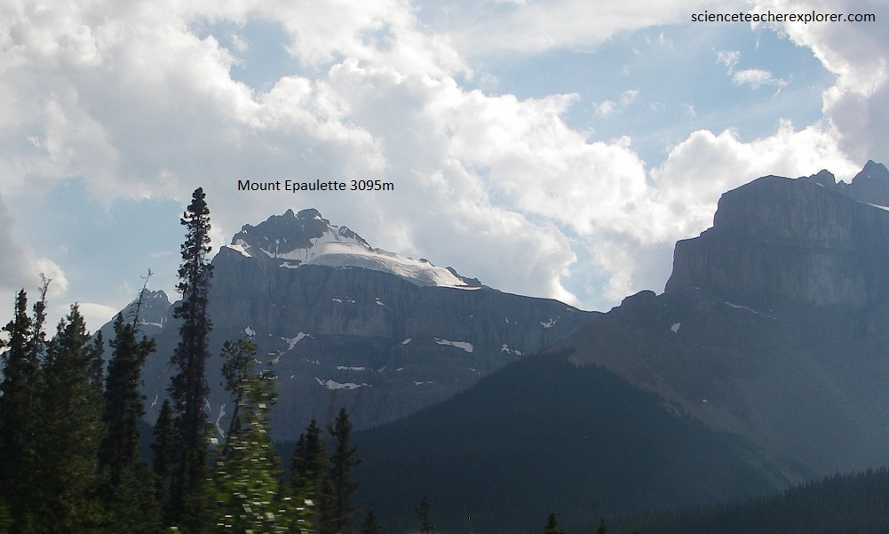 Pictured above is Mount Epaulette with glaciers on its westside, in the saddle and on ledges. It is largely made of grey and buff limestones of Middle and Upper Cambrian age and may even include some Ordovician rocks at its top.