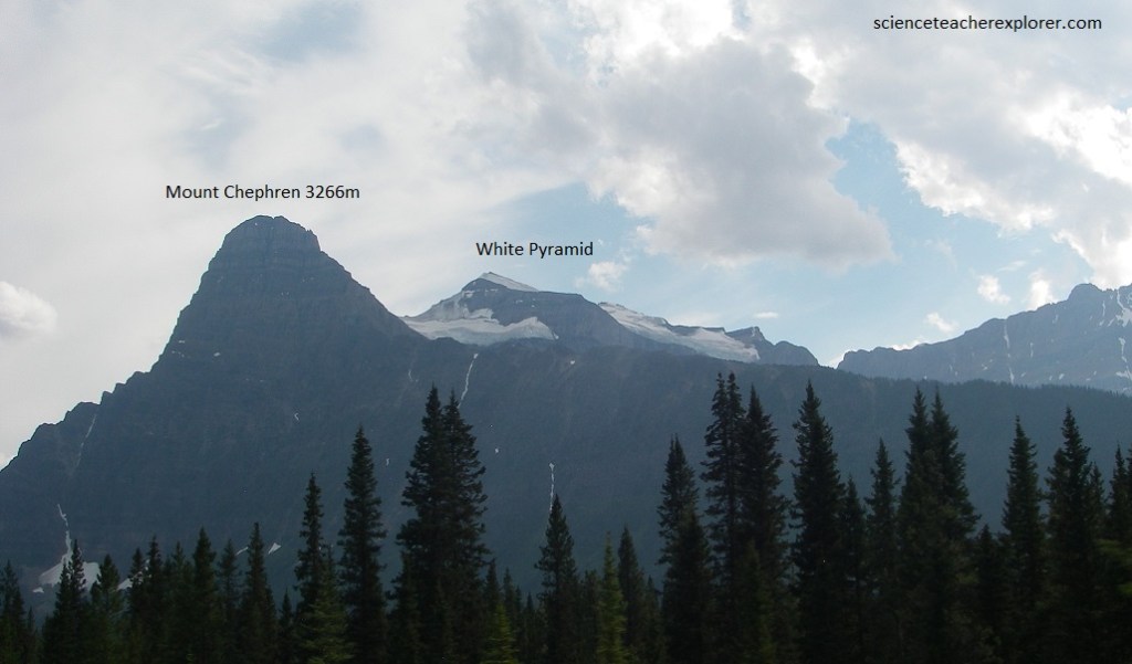 Pictured above, Mount Chephren shows its very distinctive peak, with a steep front but not quite so steep back. Its shape and marked horizontal layering make a landmark that is visible for many kilometers. Mount Chephren is conspicuously layered, with dips inclined very gently toward the west. The lower part is made of quartzites of Lower Cambrian age. Higher up in the peak, the quartzites give way to grey limestone that extends all the way to the tip. We can see a back peak a little to the west, (the White Pyramid), made entirely of the grey limestones that slope gently westward, consistent with those in the tip of Chephren itself.