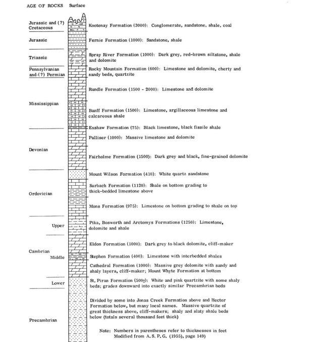 The road from Banff to Lake Minnewanka runs under Cascade Mountain along a deep valley, once the channel of Cascade River, and comes to a stop at the western end of beautiful Lake Minnewanka. Northwestward, straight up from the road, the great mass of Cascade Mountain looms across the view with three deep gashes in its lower limestone cliffs. The left one has a thin white ribbon of falling water and it is from this that the mountain gets its name. The main grey cliff in the bottom is the Palliser limestone of Devonian age. Above it, slacking off into more gentle, rounded, brownish slopes is the Banff shale formation of Mississippian age. The top of the mountain is in the grey, cliff-forming Rundle limestone, also of Mississippian age.