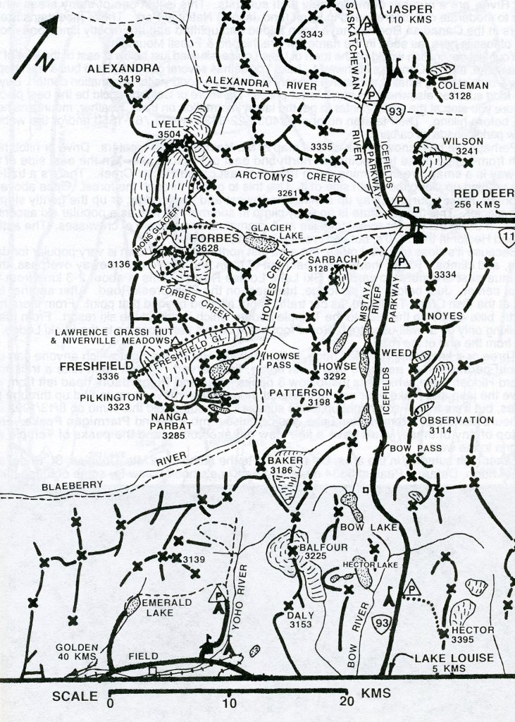 Sharp jagged peaks and rounded mountains, slow-moving glaciers and dazzling white snowfields, rushing mountain streams and gently rivers, narrow canyons and open wooded valleys, and alpine meadows and dense forests, (all of these describe Banff National Park). Banff National Park encloses an area on the eastern slope of the Rocky Mountains from the Continental Divide, including the drainage area of the Bow River above the village of Banff, the headwaters of some easterly flowing streams to the northeast and southwest, and the drainage area of the North Saskatchewan River and its tributaries above its junction with Owen Creek, about 5 km downstream from where the Banff-Jasper highway crosses the river.