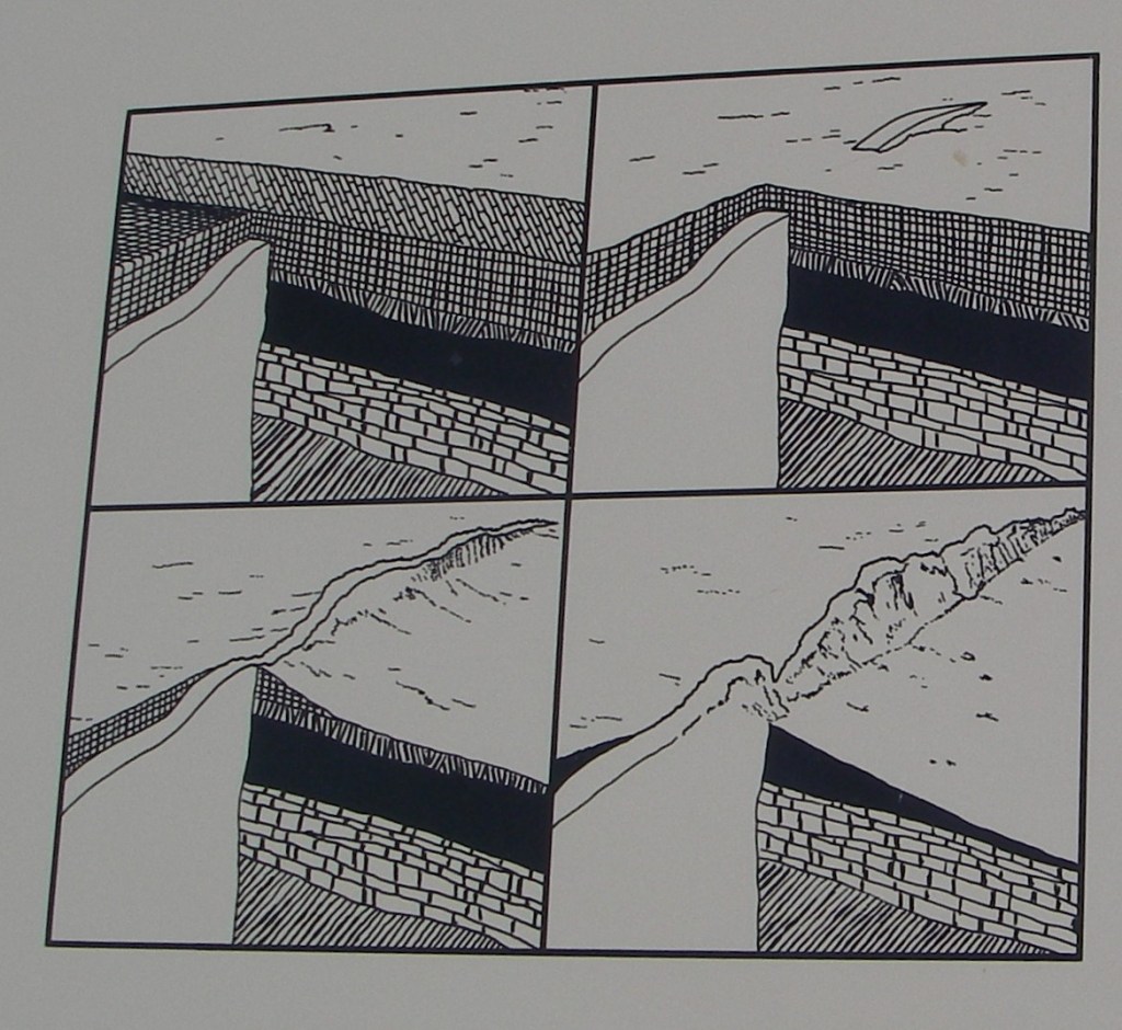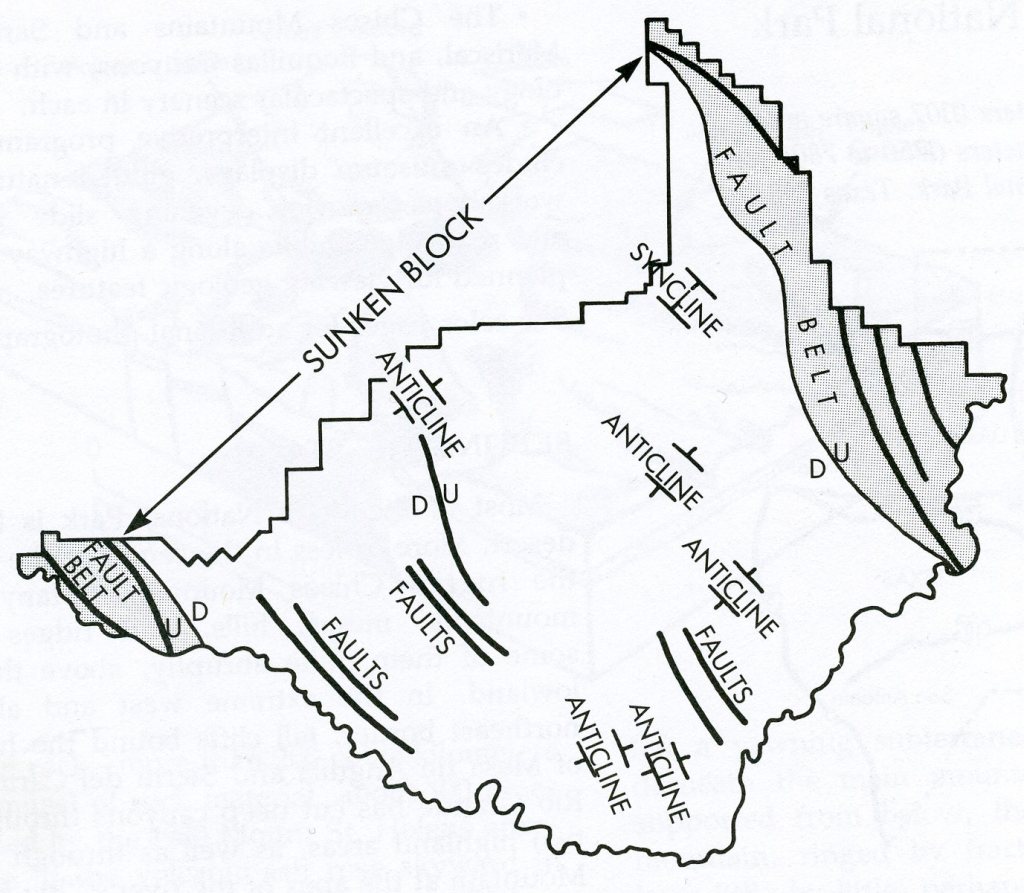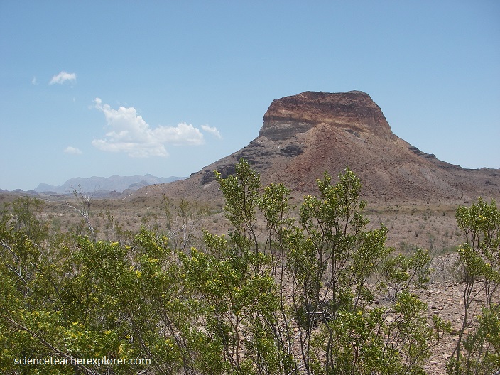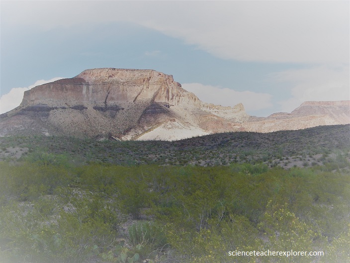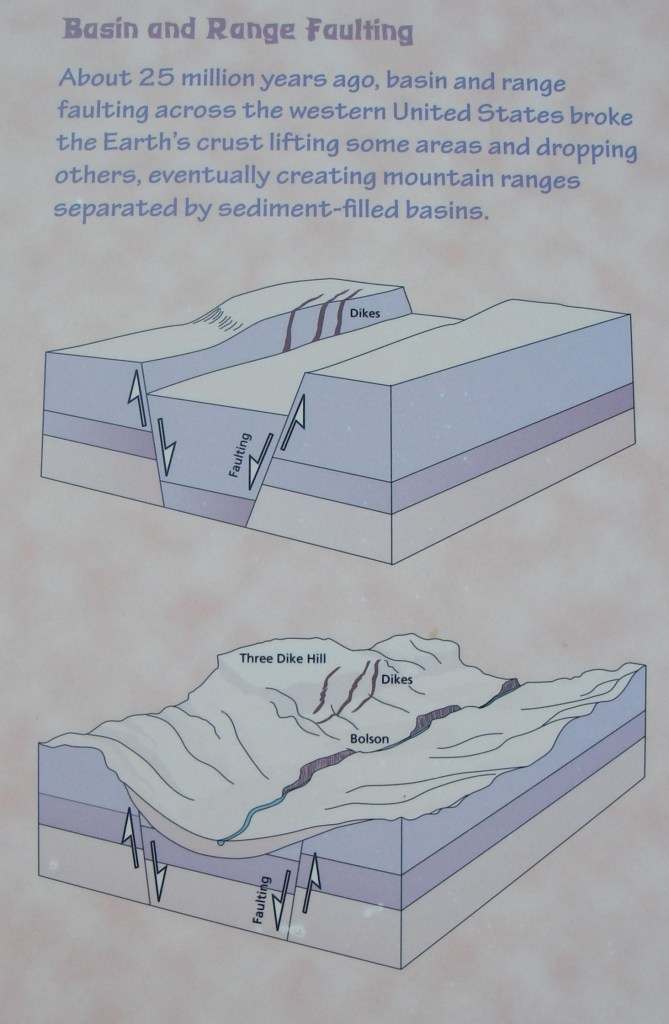 Beginning approximately 26 mya, the central area of Big Bend National Park was subjected to development of fracture zones as the continental plate that covers the western part of the U.S. was stretched between the west coast and a point east of the park. Large blocks making up much of the central mass of the park between the Sierra Del Carmens on the eat side of the park and Mesa de Anguila on the west dropped downward along active faults. Limestone layers at the base of both east and west ranges thus match layers found at the top of the mountains (Imaged below).