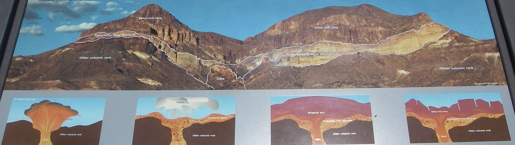 Pictured center-right above, over time, the gas content of the magma decreased, and the final eruptions produced thick slow, slow moving silica rich lava (magma that reaches the surface). The lava form thick domes that were higher than, and spread over, the crater walls. A dozen or so similar volcanic domes of dotted the landscape between Burro Mesa and Castolon.