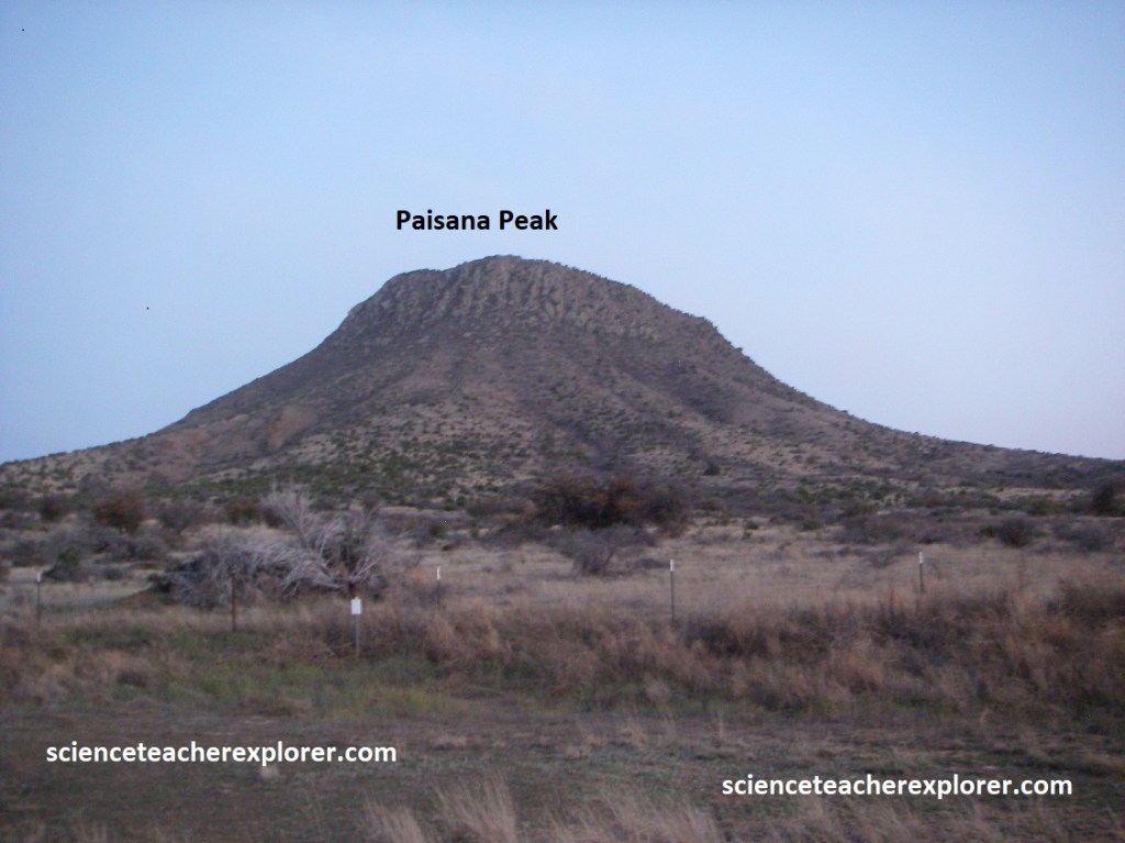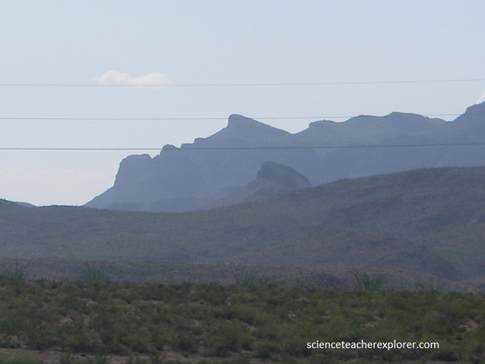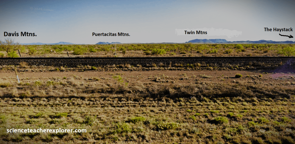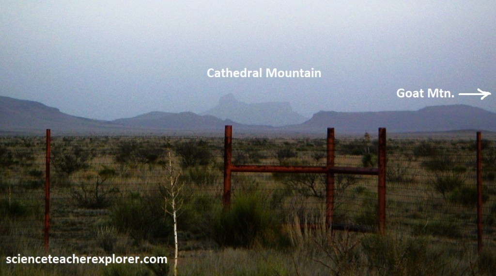 Pictured above, looking east are part of the Paisano. These mountains were formed by the lava flows and ash deposits from the Paisano volcano that erupted about 35 million years ago. The distinctive profile of Cathedral Mountain, rising to an elevation of 2287m is semi-clear to the southeast of the Marfa Light Viewing Area on US-90.