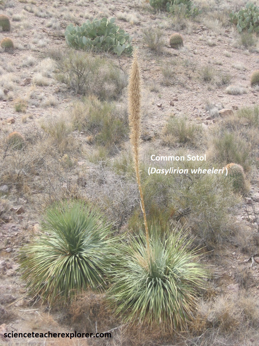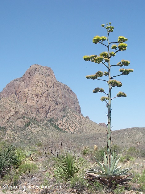 There are eleven species of agave in Texas, three of which are found in Big Bend National Park. Pictured on the right above, the gigantic Havard Agave (Agave havardiana) is one of the most visible icons in the Big Bend National Park. It blooms once in its life after growing 20-50 years. Mexican long-nosed bats pollinate the bright yellow flowers. The leaves of the century plant have a blue-gray color. The century plant also provides an excellent source of fiber for ropes, mats, sandals, etc. The hearts of the plants were harvested by the Native Americans and then baked in a stone-lined pit for two to three days. Once baked, the plant provided a source of food that could be dried and stored to help them to survive the long winter. The dried flower stalks served as building material. Century plants in Mexico provide the alcoholic beverages of pulque, mescal, and tequila.