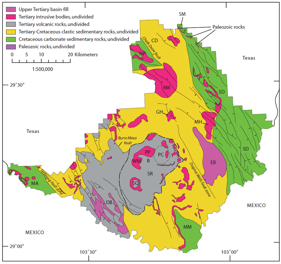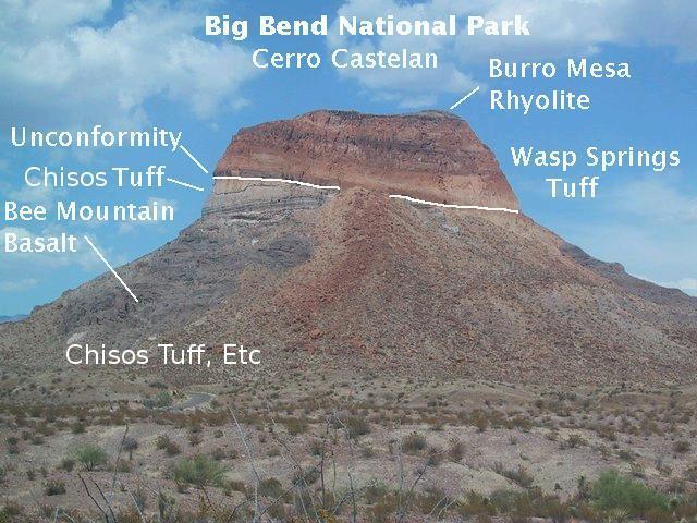 Rocks of volcanic origin dominates much of the visual landscape in Big Bend National Park. The first of a series of volcanic eruptions occurred approximately 42 mya near the present northwest boundary of the park. Upward-moving magma lifted the area that is now the Christmas Mtns and resulting fractures of surface strata allowed lava to spread in great sheets across the land.