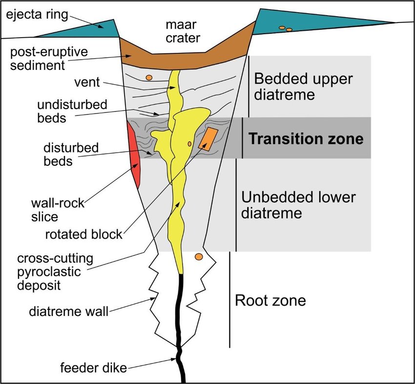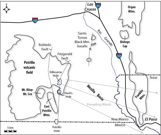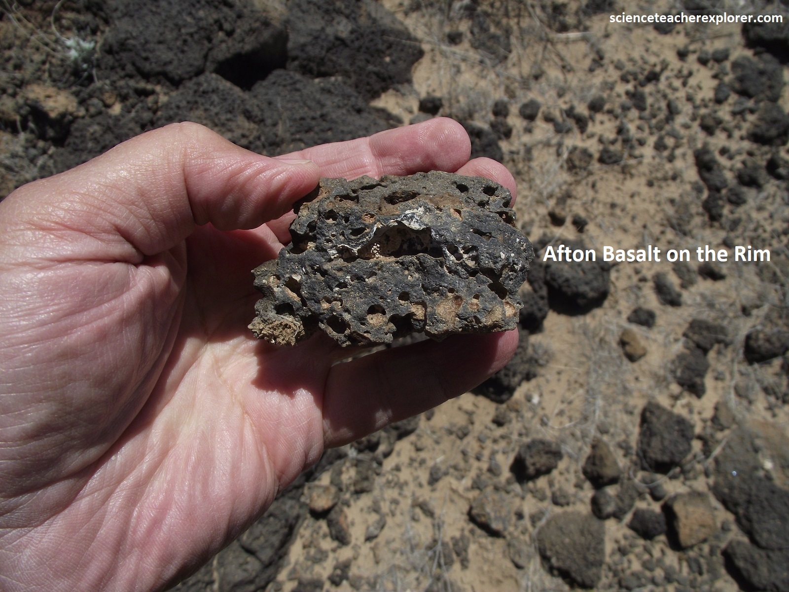 The maar-type of volcano forms when hot magma hits shallow groundwater. The water flash boils into steam and blasts a crater, or maar, in the ground. The Kilbourne Hole eruption cut through the 81,000-70,000 year old Afton basalt flows. This makes the explosion a relatively young event, (pictured below).