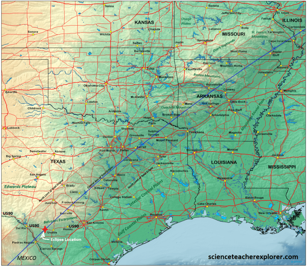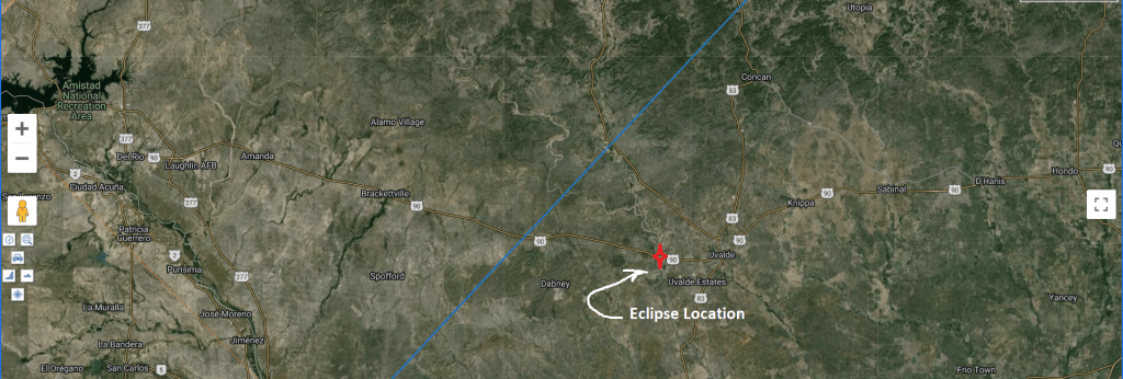 Returning to US-90 and driving southwest, I passed Del Rio, Texas. My ultimate destination for my 2024 Chihuahua-Desert trekking-adventure was the April 8th, 2024 Total Solar Eclipse, (image below).