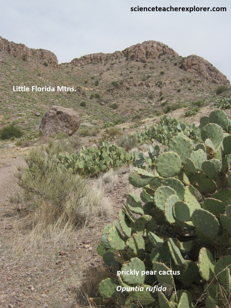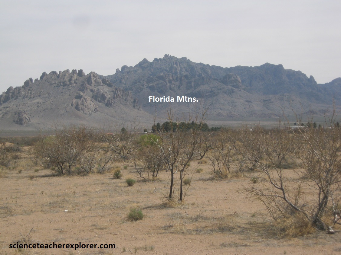 The park lies on the western side of the Little Florida Mountains. Pictured above, The Florida Mountains lie directly to the south with the Florida Gap separating the two ranges. The Florida and Little Florida Mountains are typical of the mountain desert throughout the Chihuahua Desert region. Elevations range from 1,467m along the foothills, where the state park is located, to 2,483m at Florida Peak in the Florida Mountains.