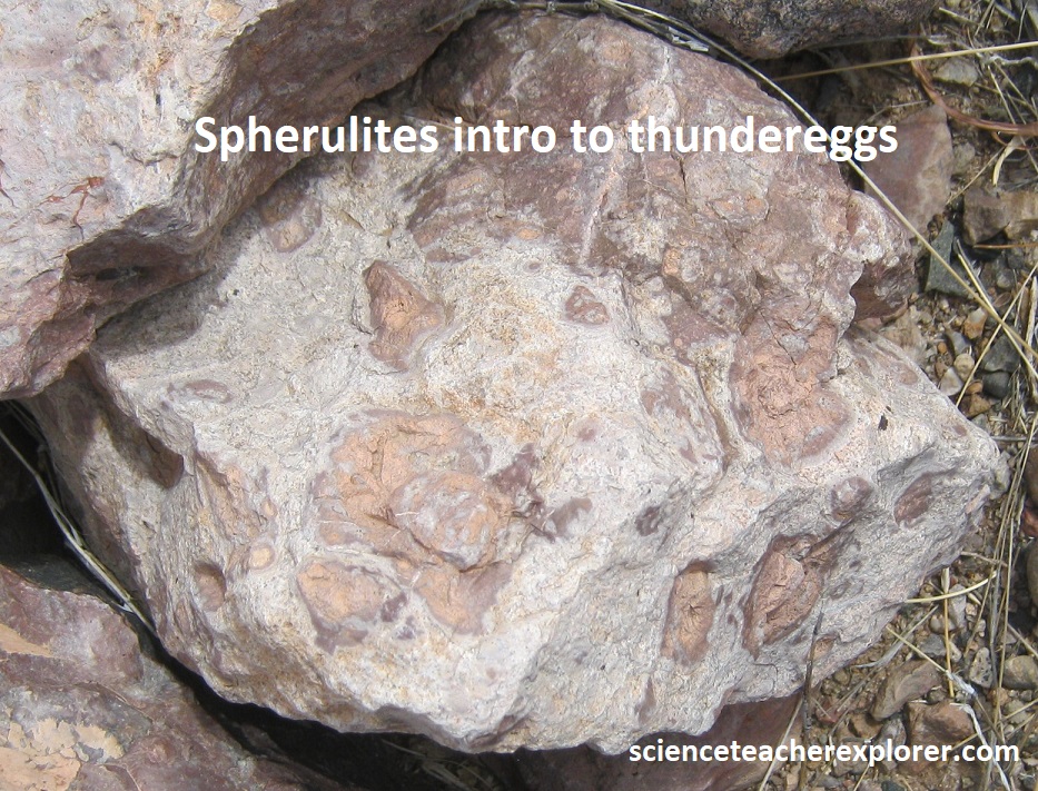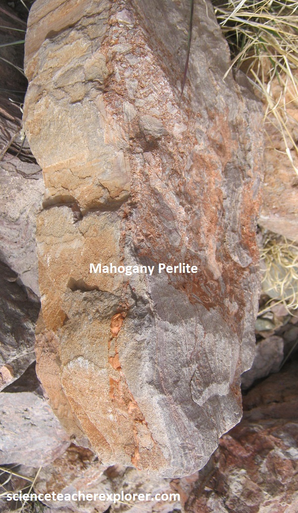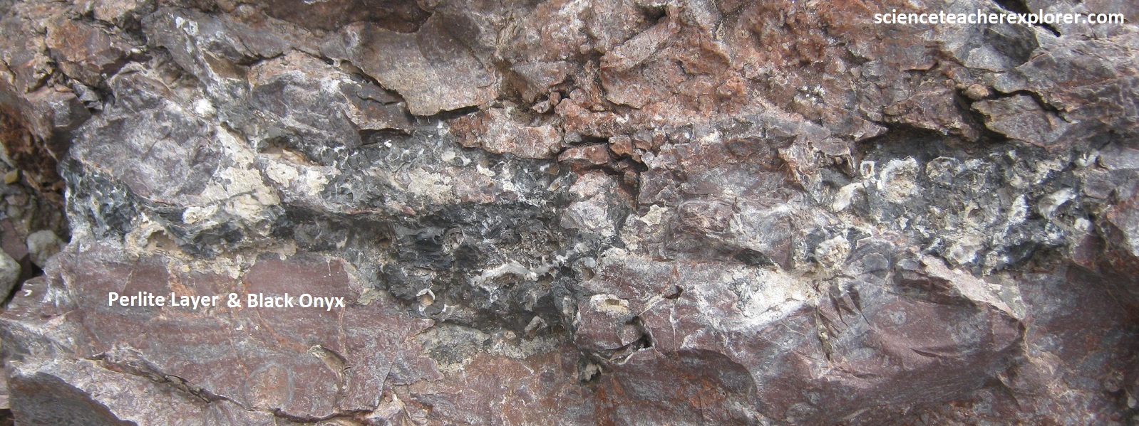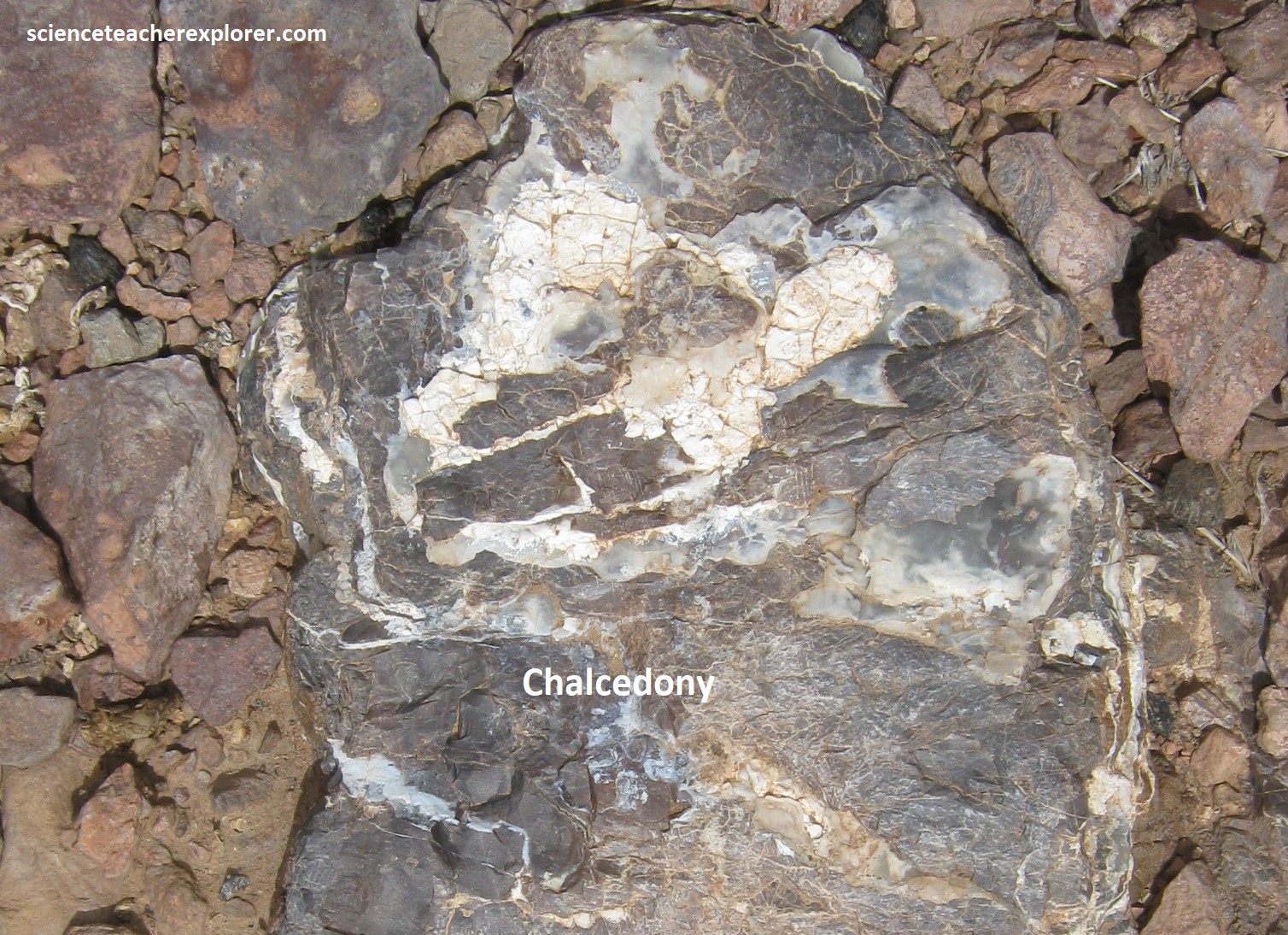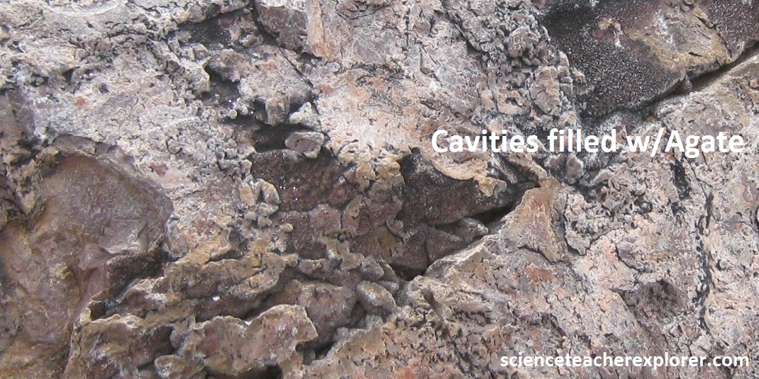 Geothermal ground waters and springs were associated with the volcanic activity. Silica cementation of the younger fanglomerate of Little Florida Mountains indicates that these fluids continued to circulate long after eruption of the volcanic rocks and during their erosion. This left deposits of various manganese- and iron-oxide minerals, along with fluorite, barite, calcite, and quartz, are found in the fanglomerate. Agate is present in a wide range of colors and is one of the minerals that visitors collect. Some thundereggs and geodes are found that contain multicolored agate in addition to well-formed quartz crystals, (pictured below). Gray perlite, jasper, onyx, agate, crystalline rhyolite, Apache tears (obsidian), and quartz crystals are among the more common rocks and minerals found in the Rockhound State Park.