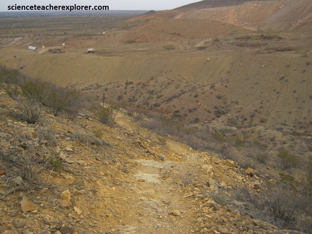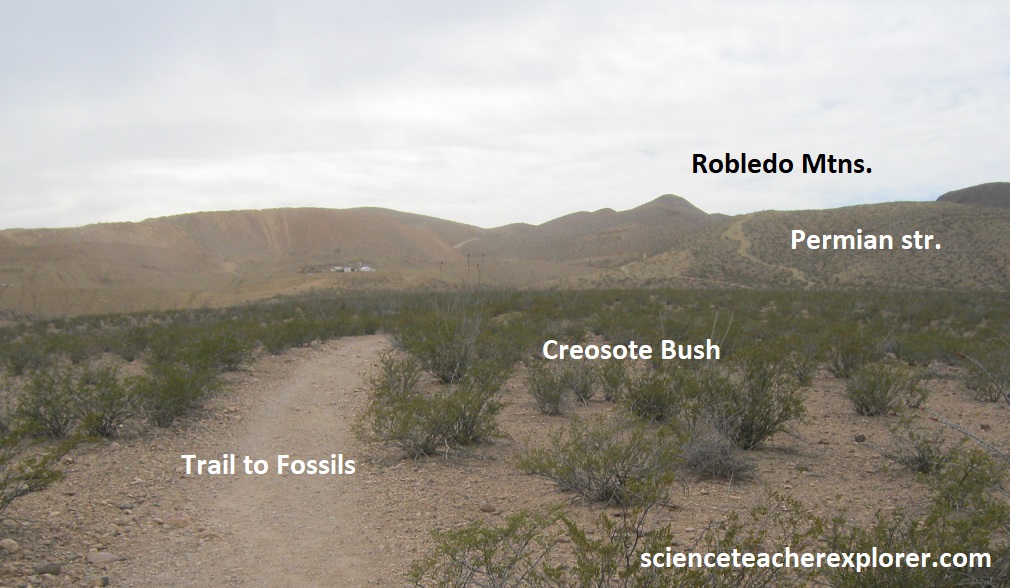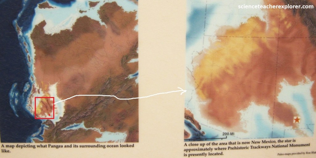 At the entrance to the Prehistoric Trackways National Monument, the Robledo Mountains looked like many other mountains in the Chihuahuan Desert, (rugged rocks doted with creosote, yucca, ocotillo and other cacti, (pictured below). However, these reddish rocks were a window into the world that existed in the Permian Period, when all continents were stuck together as a single supercontinent known as Pangea.
