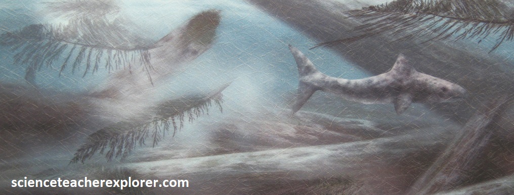 This is an illustration of the calm after a storm. This shark swims over trunks and fronds of ancient conifers that washed out to sea during a storm .