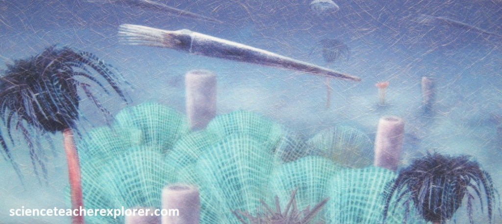 This is a scene of Permian Period sea life. There are sponges, bryozoans, crinoids and mollusks.