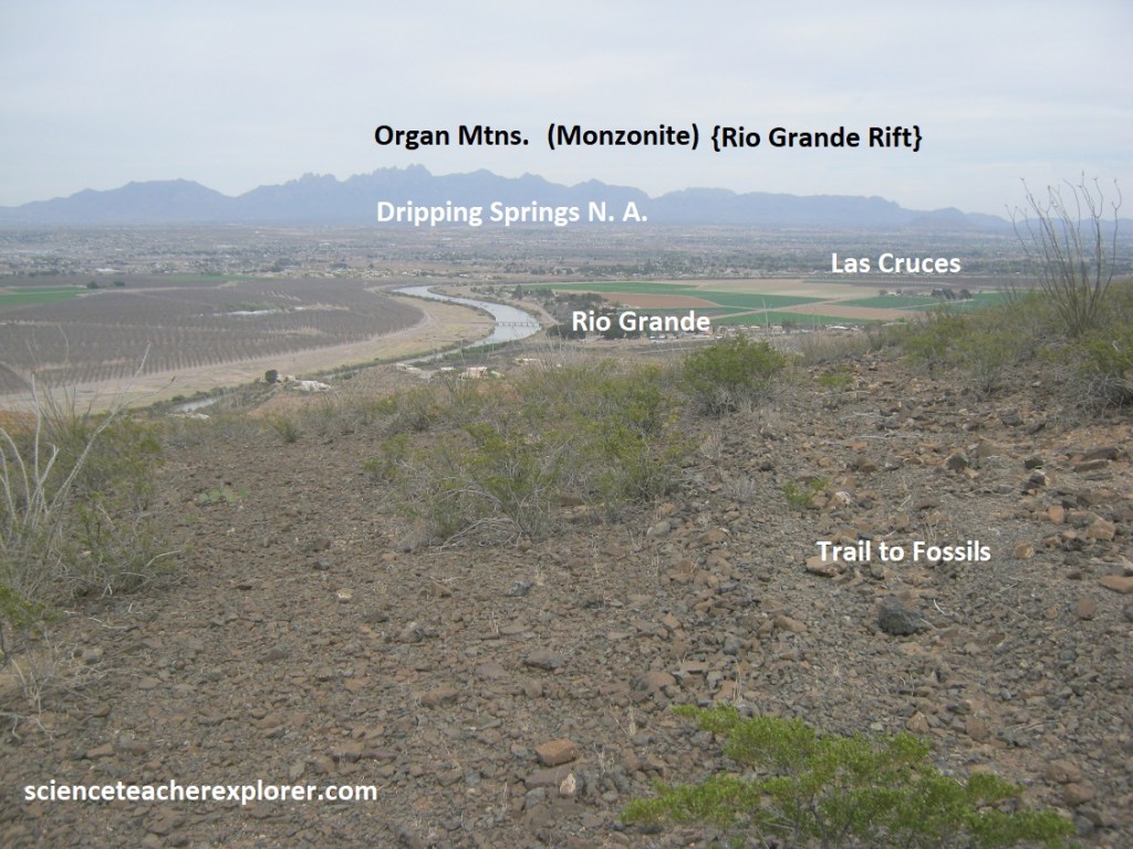 From 15-8 million years ago, when the Rio Grande Rift was actively splitting this region apart, the fault block mountains across the valley were uplifted, (pictured above). The monzonite that was once underground is now exposed at the surface. The organ-pipe shape developed from the weathering of the joints in the rock. When rock that originally formed deep underground under a lot of pressure are later exposed at the Earth’s surface, the pressure exerted on the rocks is much less, so they expand. Cracks, called sheet joints, open up, and the rock weathers into a rounded shape, appearing-like organ pipes. Hence the Organ-Pipe Mtns.