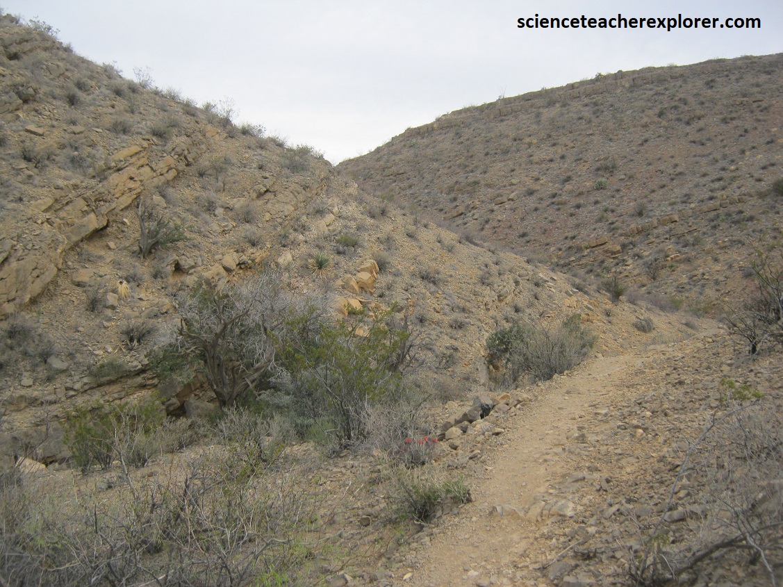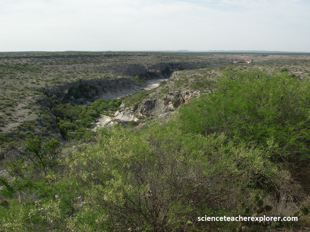 Water is scarce and limited to wells and hidden springs. Pictured above, a variety of plants thrive in this environment, including yucca, prickly pear cactus, barrel cactus, ocotillo, creosote bush, mesquite, and hackberry; juniper and scrub oak are common in the canyons.