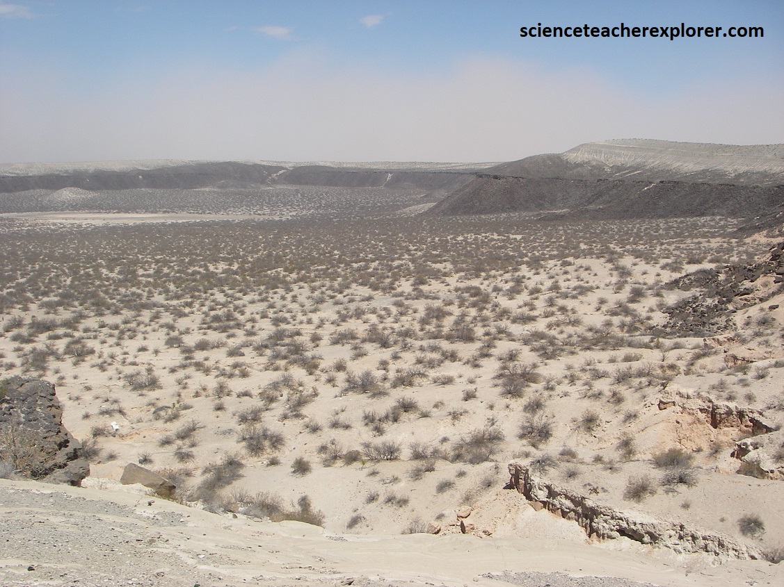 Surrounding the crater are pale-colored base-surge deposits that form when there is more steam and gas in an eruption than ash and other Pyroclastic material, (pictured below).