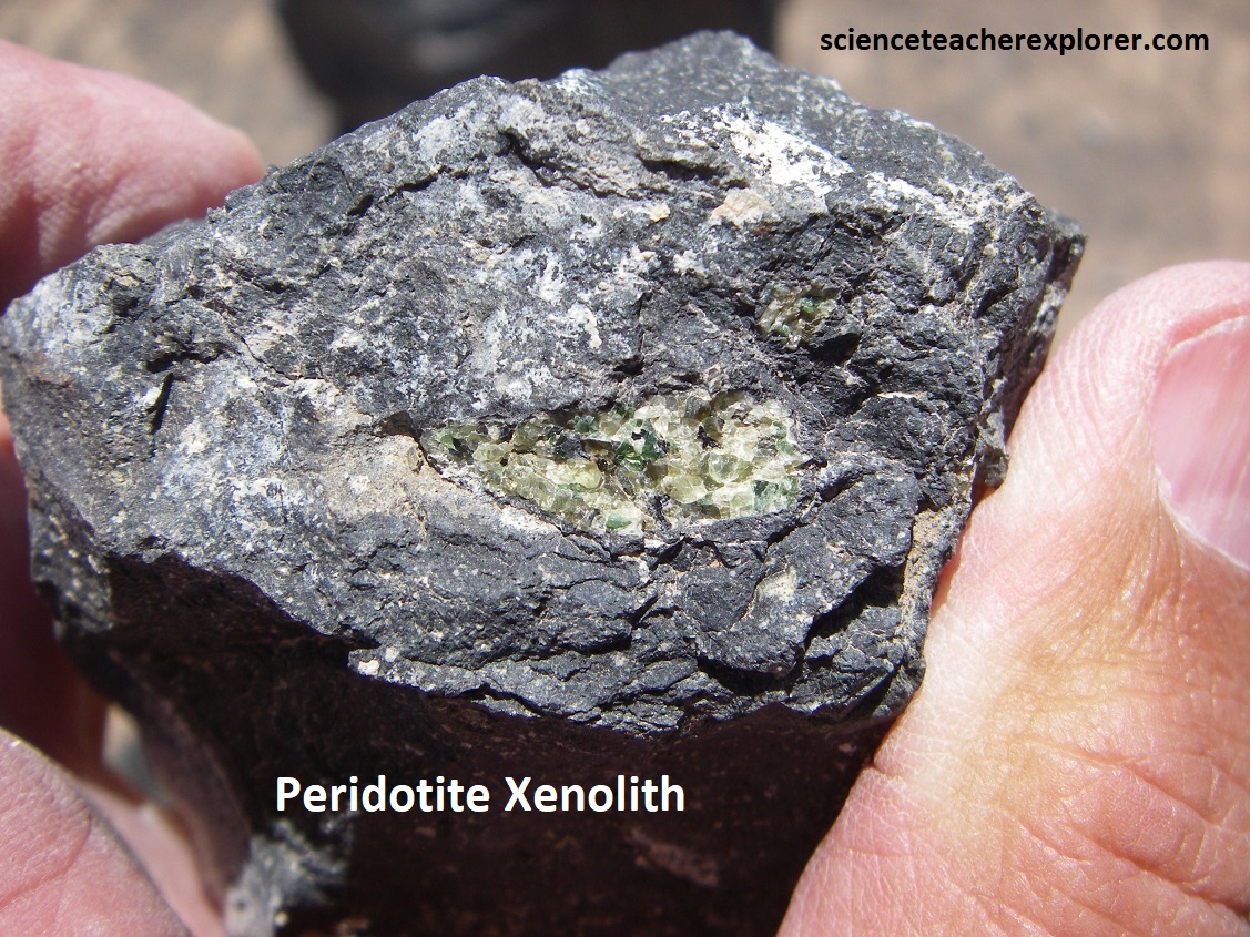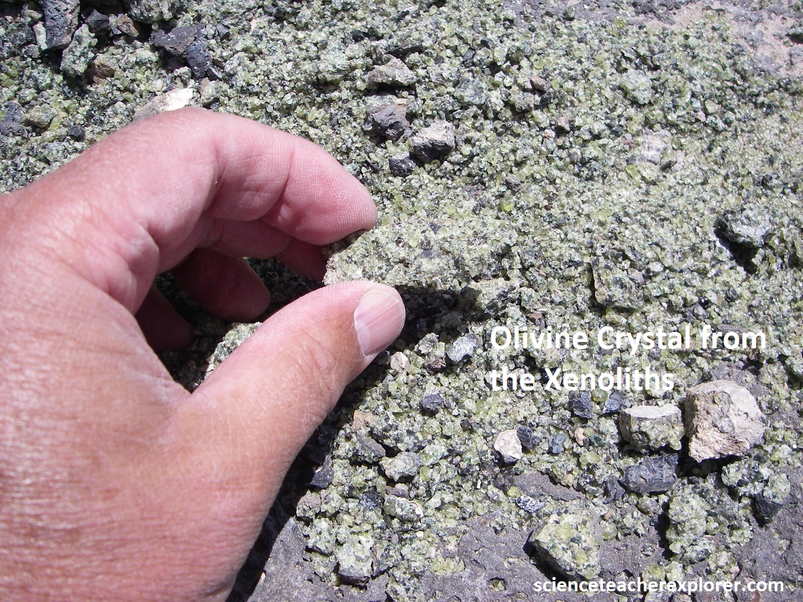 Kilbourne Hole is best know for the volcanic bombs and xenoliths. A volcanic bomb forms when lava explodes from a volcano. As the molten blob flies through the air, it cools into an oval-shaped blob of basalt. However, the volcanic bombs at the Kilbourne Hole contain xenoliths, (pieces of rock picked up from the magma from deep below). Since the originating magma underground was 64 km deep, then the xenoliths contain pieces of deep upper mantle crystals. These are extremely rare to find, (i.e. olivine or even diamonds). Pictured below are crystals of the mineral Olivine & Peridotite found within these xenoliths. Notice the Peridotite xenolith is surrounded by the dark basaltic rock-lava.