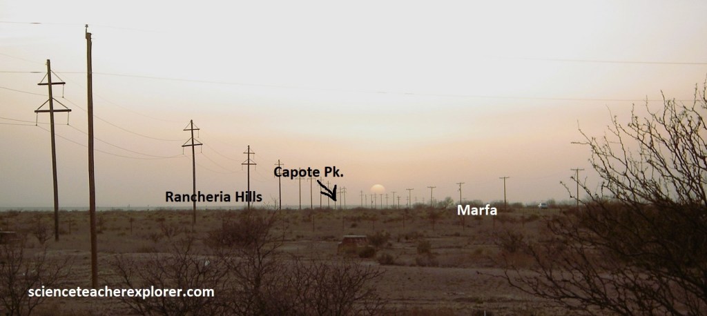 Pictured above, looking west is the flat alluvium plain of the Marfa Basin. On the distant horizon, Capote Mountain of the Sierra Vieja Range would be seen if it was clearer. Off the south side of the mountain , Capote Falls flows diring the wet season. {Mineral deposit left from the water have formed a capote or cloak that gives the mountain its name}. Movie buffs may recall that the 1955 classic “Giant” was filmed on the Ryan Ranch, 24 km west of Marfa, (starring Elizabeth Tayler, Rock Hudson and James Dean).