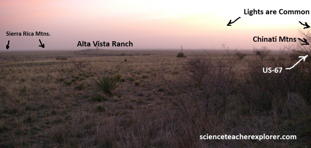 An explanation as to why the lights cannot be located is an unusual phenomenon, where atmospheric conditions produced by the interaction of cold and warm layers of air refract and reflect light so that it can be seen from afar, but not up close. The mystery of these lights still remains unsolved. Pictured above, looking south, (over the Marfa Army Air Field), where the lights are usually reported, are the Sierra Rica Mountains in Mexico on the southern horizon, (the wind-blown sand made it impossible to see in the photo). The Chinati Mountains are on the skyline to the southwest, where US-67 crosses on its way to the small towns of Shafter and Presidio.