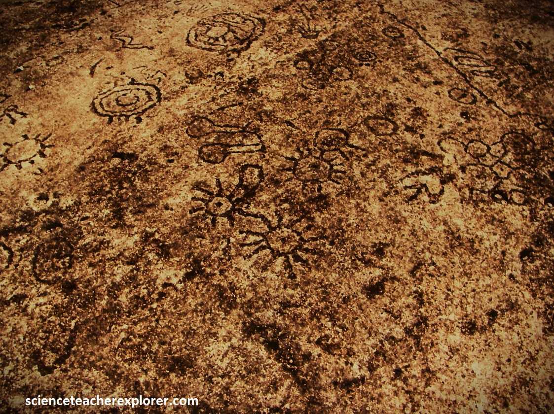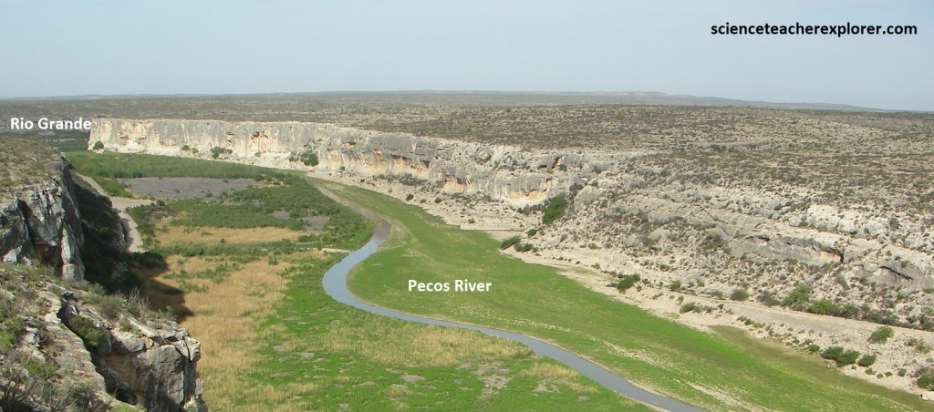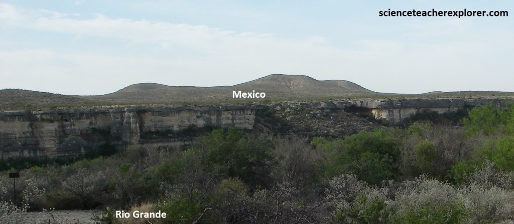 A hundred million years ago, this area around Seminole Canyon was a shallow sea teeming with live. Some of these creatures had shells. When they died, their shells fell to the bottom of the sea, (pictured below). Over time, the shells broke down, compacted, and became limestone. The sea rose and fell, leaving layer after layer. The canyon walls and road cuts into the layers of stone formed across Central Texas. Limestone’s a soft stone. Water from creeks found cracks and carried away the grainy limestone to form canyons, (including Seminole Canyon).