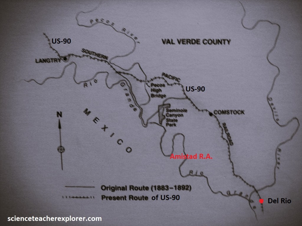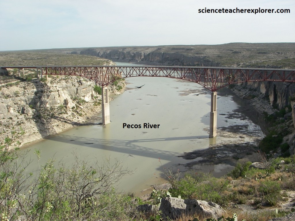 Pictured above, high canyon walls dominate the last 100 km of the Pecos River before it enters the Rio Grande. The southern Pacific Railroad built the first high bridge across the Pecos River in 1891. The first highway bridge to spa the river was built 1.6 km down river from here in 1923. Just 17m above the water, the 1923 bridge was destroyed by floodwaters in 1954. Two temporary low-water bridges built nearby in 1954 and 1955 also were destroyed by floodwaters. A new 437m long bridge was completed here in 1957. At 91m above the river, it is the highest highway bridge in Texas.