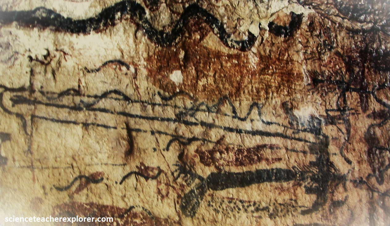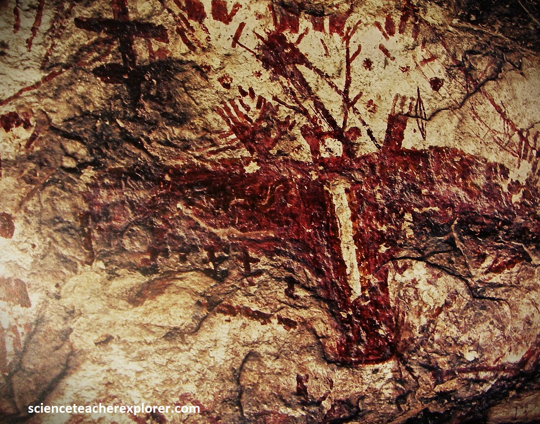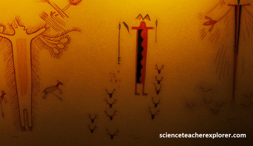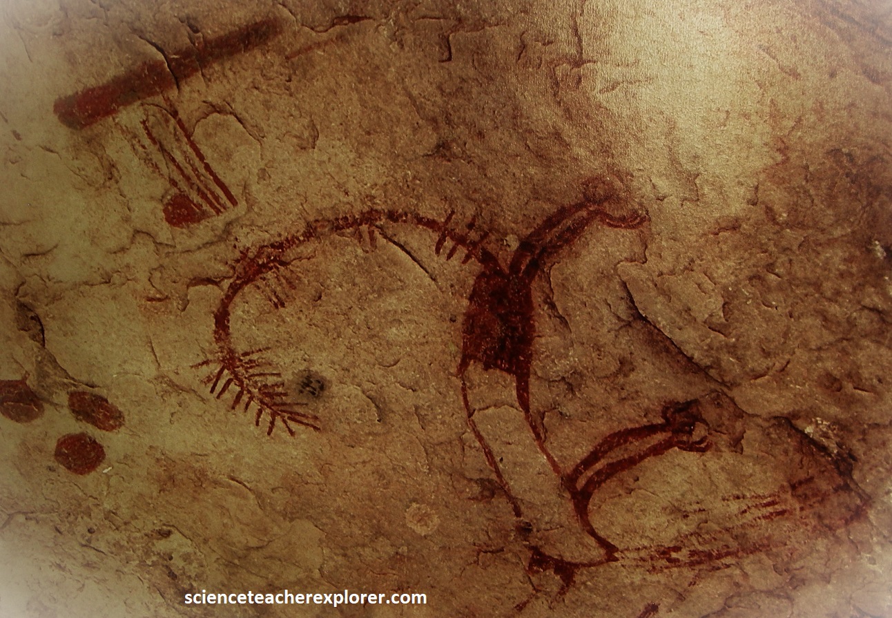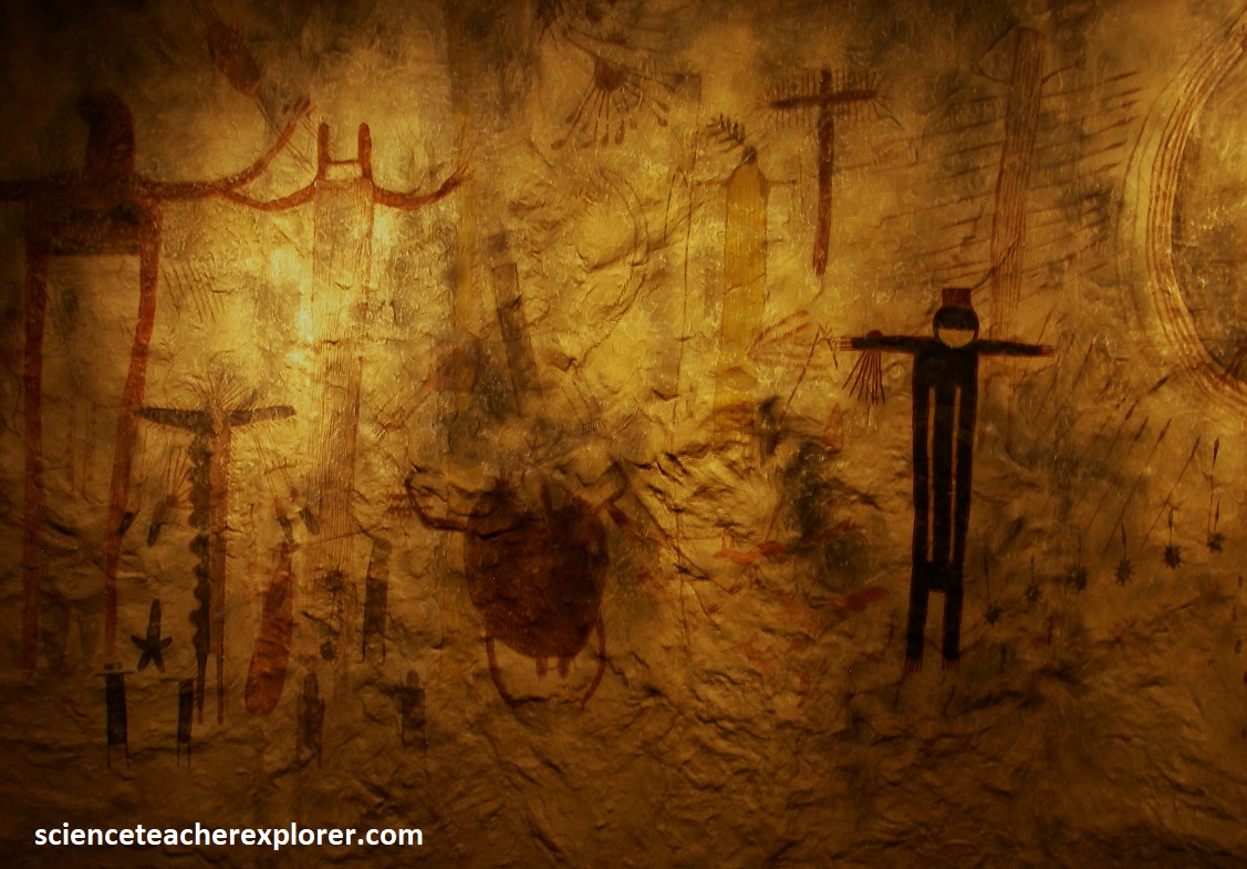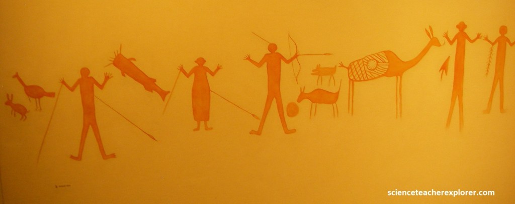 The Devil’s River Limestone walls surrounding the people of the lower Pecos provided space for artistic expression. Art was widespread in the primitive, world, and in the area of modern Val Verde County, perhaps 5,000 years ago, an artistic tradition began which has been compared to the famous cave paintings of France and Spain. The scene recreated below, on interpretive signs, are samples of pictographs from Panther Cave in Seminole Canyon.