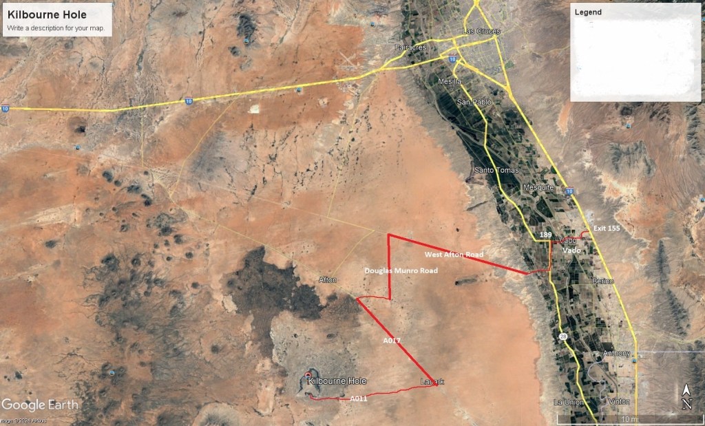From exit 155 on I-10, I headed west on Vado Drive to a stop sign on NM-478. I turned left, (south), and drove 0.3 km to NM-189. I turned right, (west), and drove 1.8 km to NM-28 where and then turned left, (south) and drove 3.2 km. At Afton Road, I turned right west and drove 18 km on a dirt road. After passing a structure in a gully, I turned left, (south) on another dirt road called Munro Rd. and drove another 10.5 km to a Railroad crossing and turned right across them. This took me to a graveled county-road called A017 where I turned left and drove southeast for 11.6 km. Looking carefully at the signs, I turned onto an unmaintained road called A011. This road required 4WD. I drove about 13 km to Kilbourne Hole. WOW! what an adventure with the GPS.