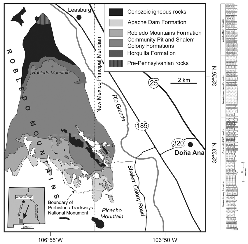 In the mid-1980s Jerry MacDonald, an amateur paleontologist, brought national recognition to the Robledo Mtns. when he found long, intact fossilized trackways. These trackways belonged to the Permian Period (280-240 million years ago), tens of millions of years before the dinosaurs. Under the supervision of the Smithsonian Natural History Museum, MacDonald excavated thousands of these trackways from what is now know as the Discovery Site, (pictured below). Further research conducted has proven the Robledo trackways as one of the most important Late Paleozoic fossil records in the world.