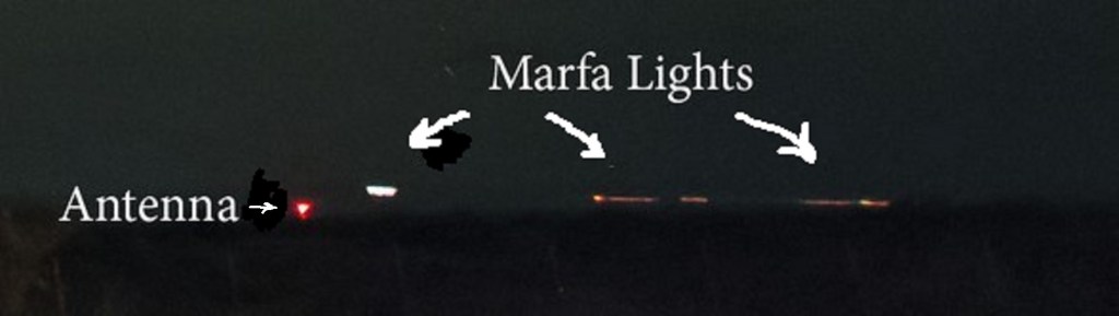 Robert Reed Ellison, a young cowboy, reported sighting the lights in 1883. He spotted them while tending a herd of cattle and wondered if they were Apache campfires. Apache Natives believed these eerie lights to be stars dropping to the earth. A example of these is seen below, to the right of a red radio-tower light. (a common location to see these lights while visiting the, “Marfa Lights Viewing Center next to the US-90, 13.6 km east of Marfa”).