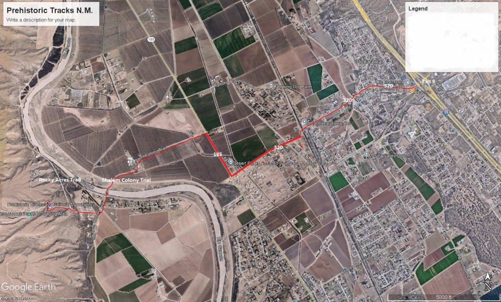 From exit 9, I dove through town on NM-320 west to NM-185. From there, I right and drove 0.8 km, to cross the Rio Grande, and then turned right onto the Rock Acres Trail. I then drove about 0.4 km and beared left onto the dirt road going west called the Permian Track Road, (imaged below).