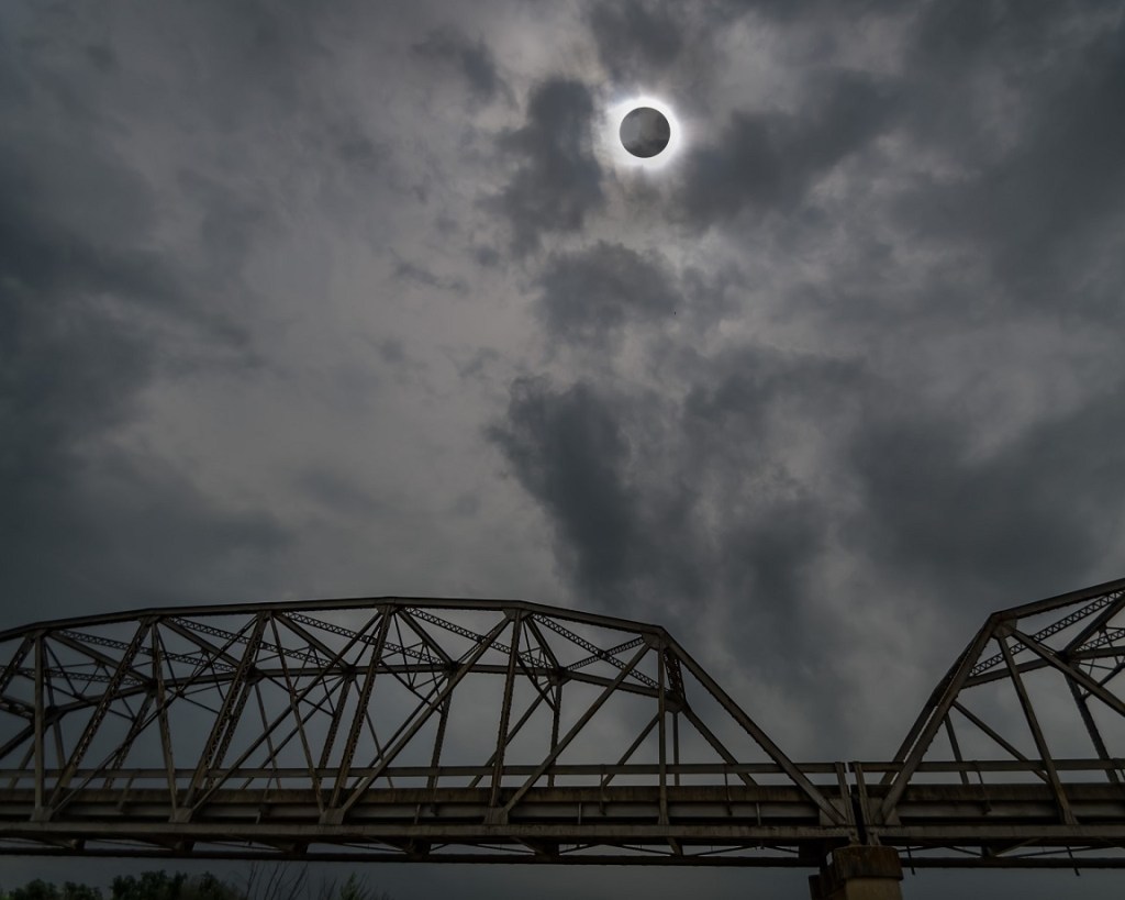 A very disappointing event for us at the Uvalde bridge. With the Sun likely in the peak of its 11 year solar cycle, (known as solar maximum), I was hoping to see the corona blast out from all sides of the Moon. But no luck! However, Marc Curtis had his son-n-law, north of us, near Austin, in the Hill-country. He pulled off some great images of the totality, through the clouds. Marc was able to splice together, what we should of seen. I’ve included that image below: