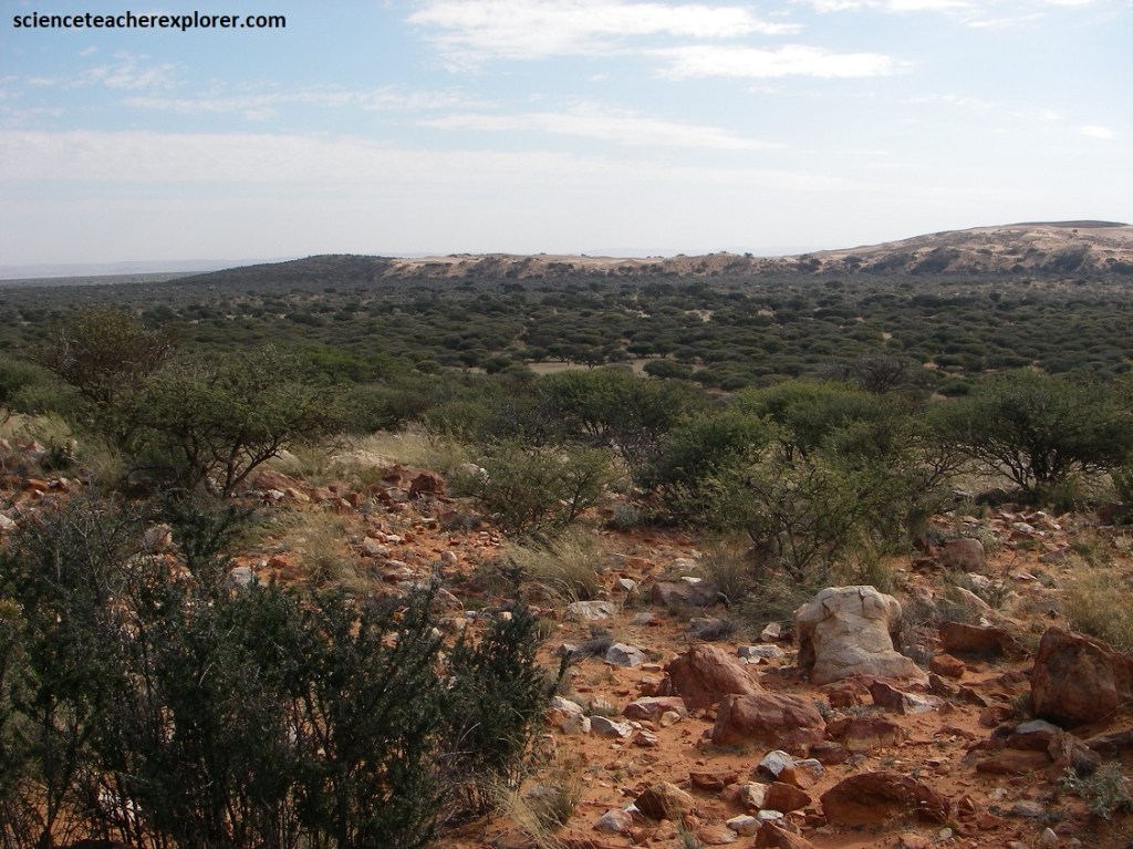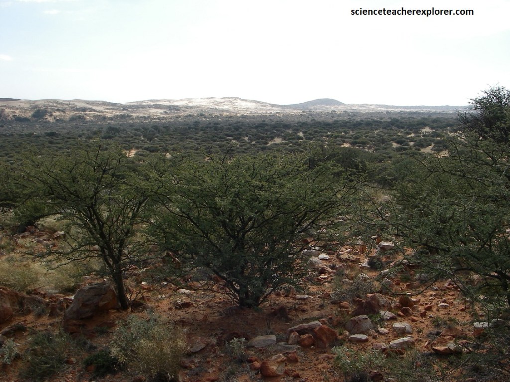 The Kgalagadi Transfrontier Park has terrain that consists of red dunes, sparse veetation, occasional tree, and the dry riverbeds of the Nossob and Auob Rivers. The rivers are said to flow only about once per century. The red sand is the result of a thin layer of iron oxide that coats the grains. The entire western Kalahari Desert is characterized by long chains of dunes, oriented roughly to the north or northwest. Over millions of years, erosion planed off the mountains and formed the low hills that we see in the Kalahari Desert today. The main characteristic of the Kalahari is the nature of the soil is fine sand that color varies from red in the drier parts and grey in the areas that have a higher rainfall. The red soil indicates that it is a dry region.