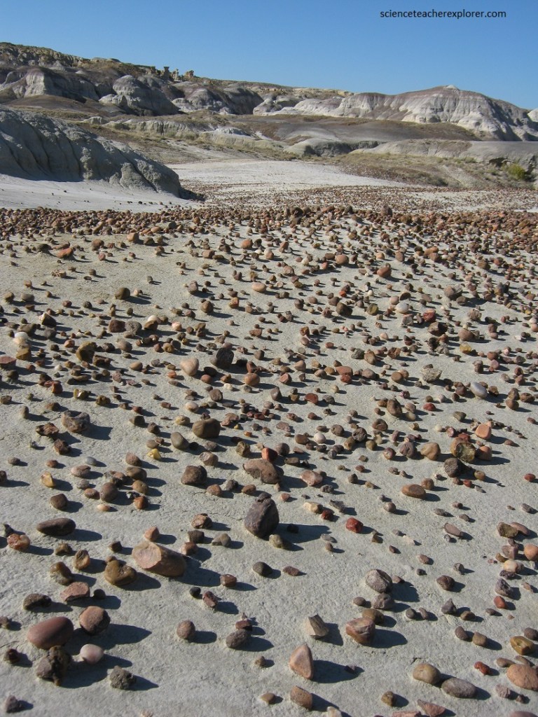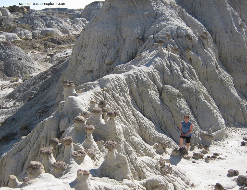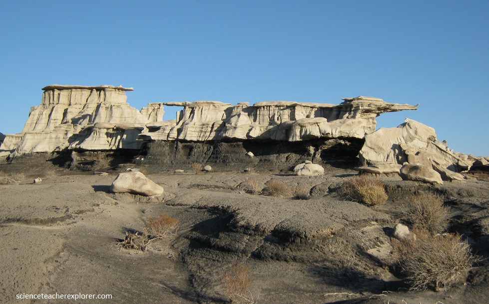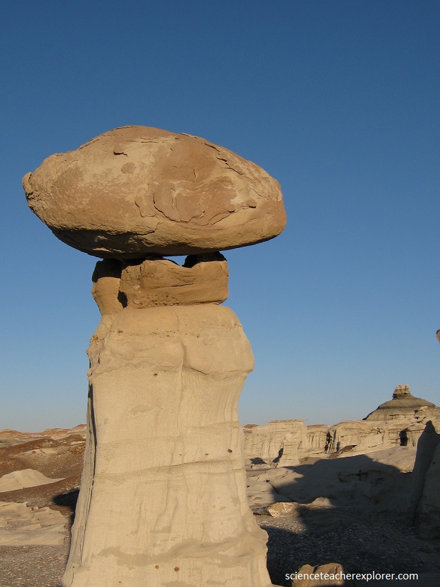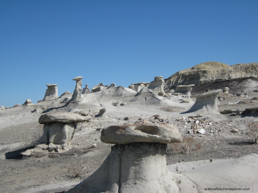 Ash erodes very quickly and does not hold water long. These two qualities make for poor growing conditions and explains the general lack of plant life. Anywhere that hard materials sit atop a layer of ash, hoodoos have eroded out of the matrix. While igneous protrusions might be a more common source of stone pillars and pedestals, in the Bisti Badlands, pillars and hoodoos exist solely because everything around and below them has been removed by wind and water, over time.