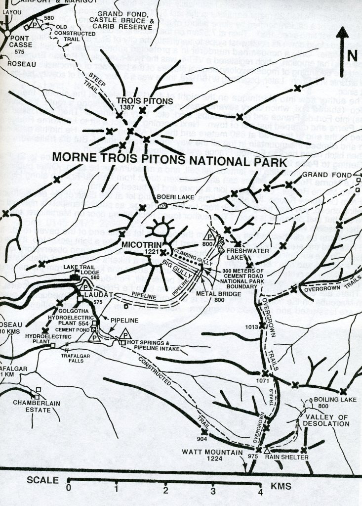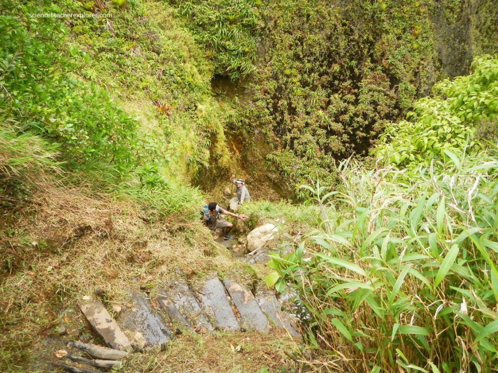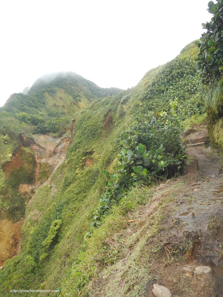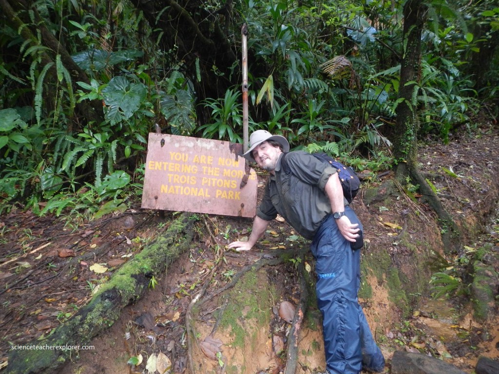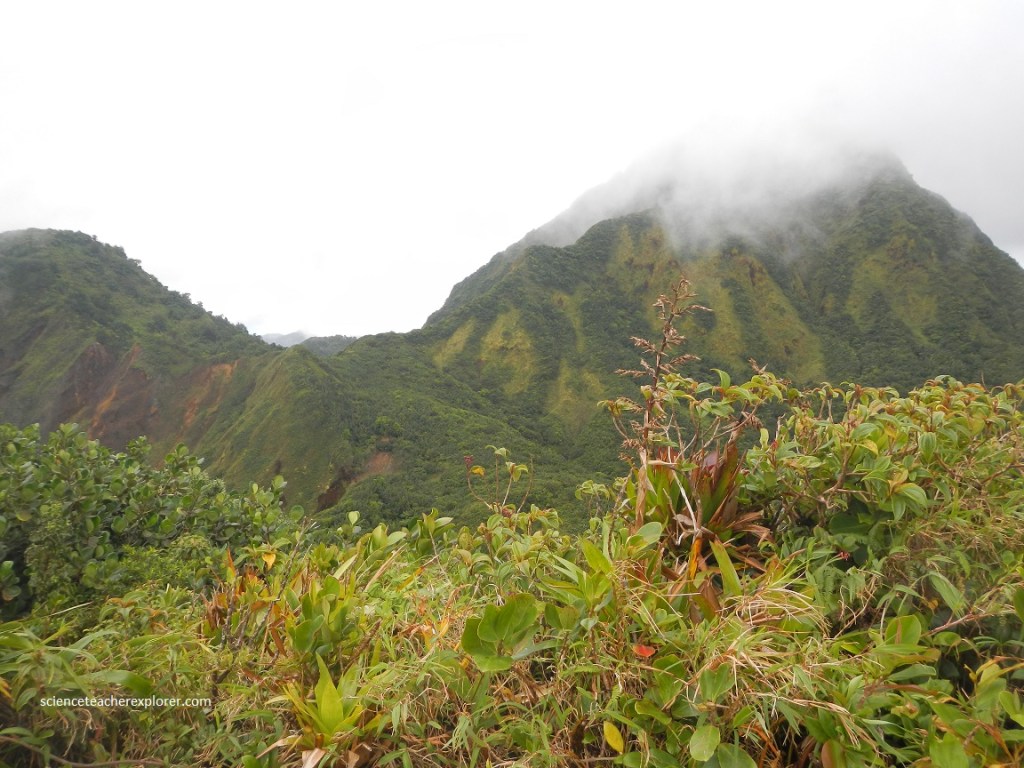 The hike began at Ti Tou Gorge and entered the Trois Pitons National Park. The first part of the hike climbed for almost an hour, crossing several high ridges as the trail wound through a rainforest. There were no switchbacks and much of the trail was slippery and steep. Mike and I climbed another 760 meters in elevation, only to leave the rainforest and begin the descent into the “Valley of Desolation”.