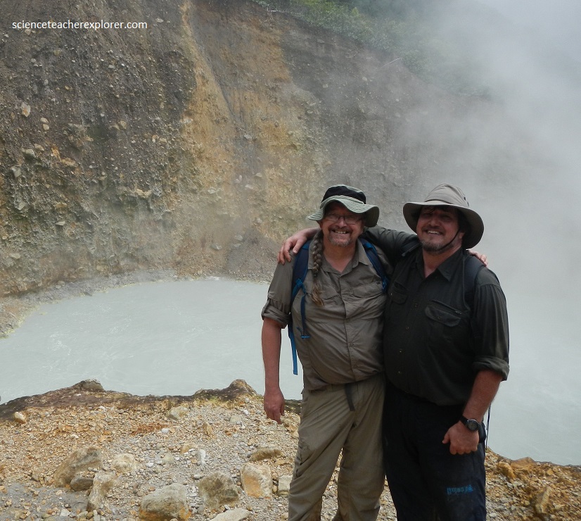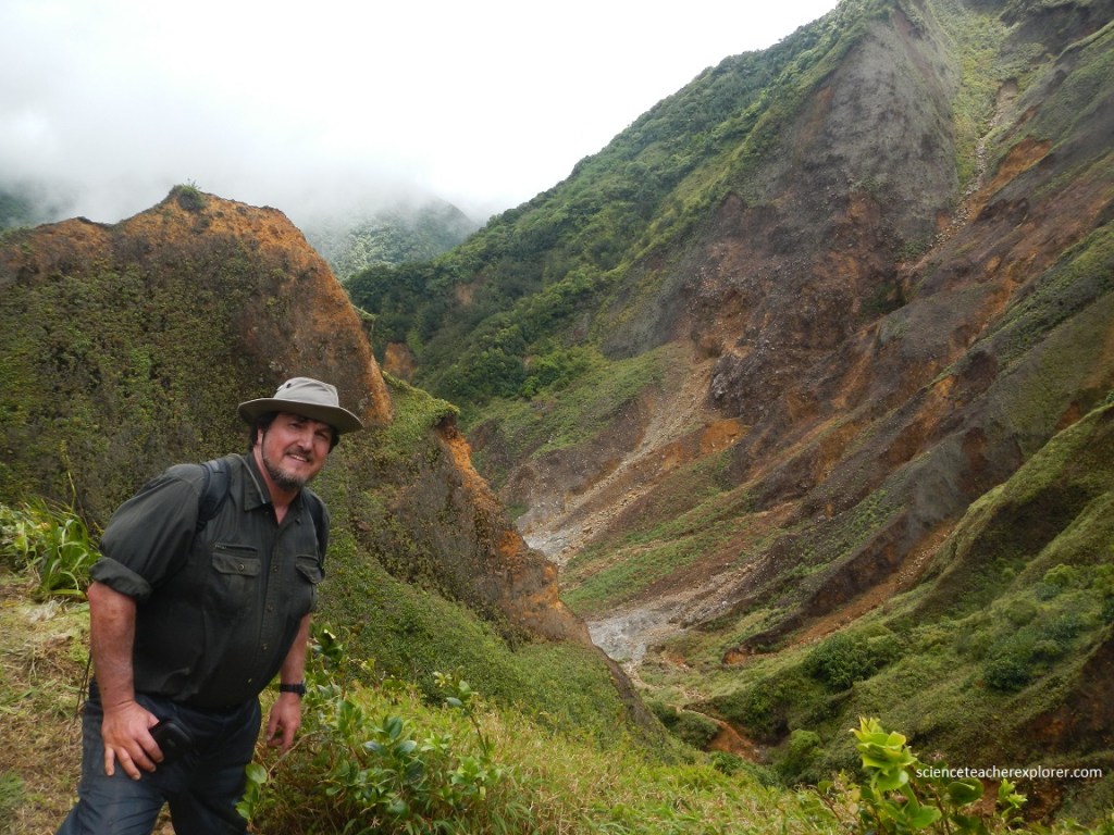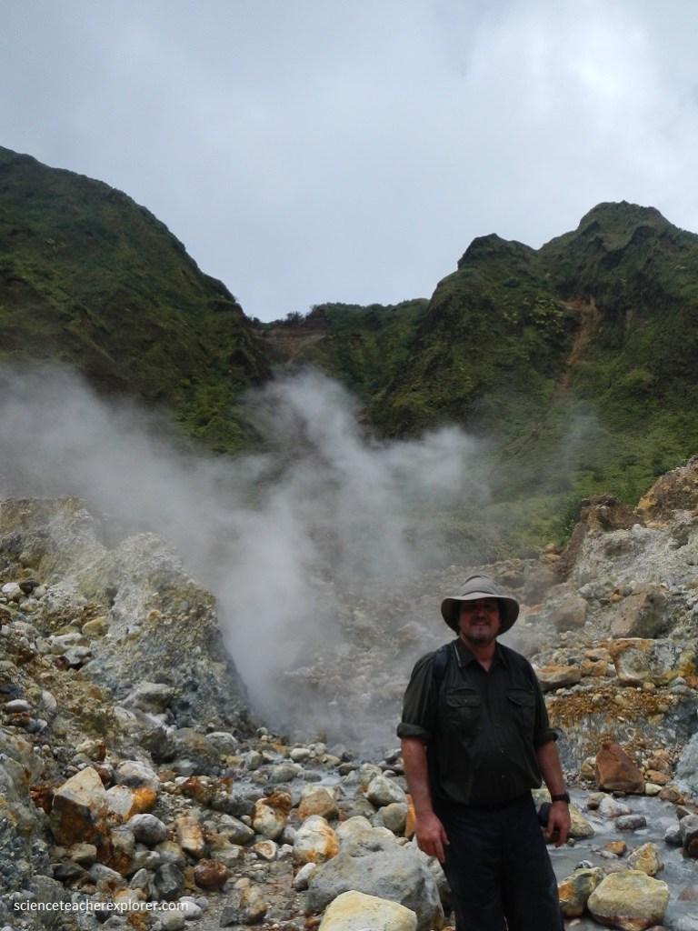 Dominica is a 750 km2 island of rugged topography and pristine rainforest which features nine volcanic centers that are <2.6 Ma. Dominica’s coastlines and interior valleys abound with thick (>20 m) ignimbrite deposits, composed of pumice clasts, rock fragments, and ash from solidified pyroclastic flows. There have been no documented explosive eruptions of large magnitude in Dominica in the last 20,000 yrs. The most recent activity involving magma was a lava dome collapse and of where Mike and I hiked up-to. Dominica’s most recent volcanic activity was several explosions of steam and ash violently ejected from hydrothermal vents.