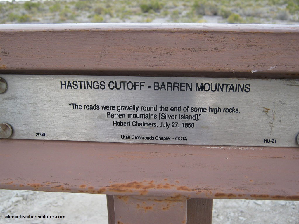 The terrain over the Salt Lake Area of the Hastings Cutoff is mostly level with only the pass through the Cedar Mountains and topping the Gray-back Hills presenting difficult grades for the draft animals. But the 60 mile stretch across the wastes of the Great Salt Lake Desert (Bonneville Salt Flats) through sand dunes and mud flats was another matter.