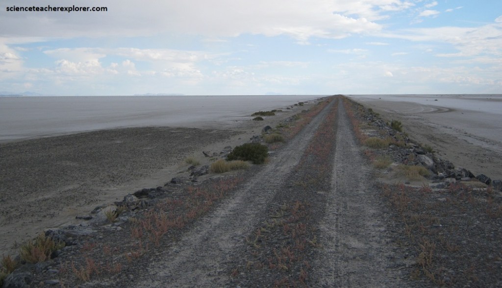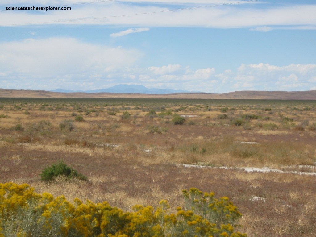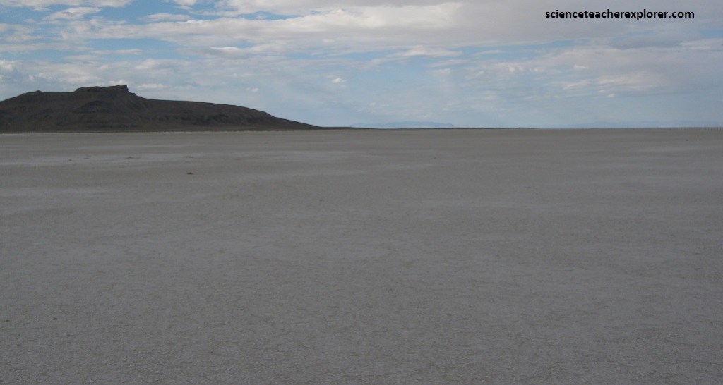 Pictured above, the isolated butte is the “Floating Island”. It was given this name because the Island seems to float in a mirage of water when you are driving along I-80 twelve miles south. The top portion of the Island stuck out of the surface of Prehistoric Lake Bonneville and the mud flats was the bottom of the lake. The mud flats were drilled many years ago, south west of here, to a depth of 2600m.