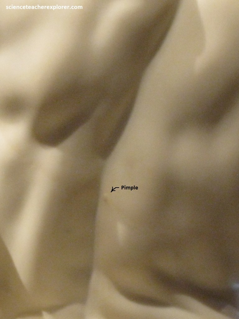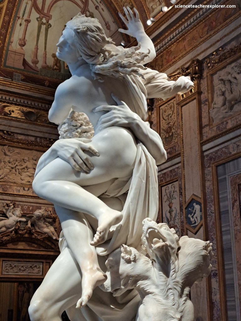 Pictured above, Pluto is squat, rough and uncouth, with knotted muscles and untrimmed beard. He is trying not to hurt her, but she pushes her godly molester away and twists and twists to call out for help. Tears roll down her cheeks. Note how Pluto’s fingers dig into her frantic body as if it were real flesh. Bernini uses Carrara marble to accomplish this amazing scene. [He was only 23 years old]. I even noticed a small imperfection in the middle of the back of Pluto. It was obviously put there on purpose by Bernini, to show that Pluto wasn’t entirely perfect as a god, (pictured below).