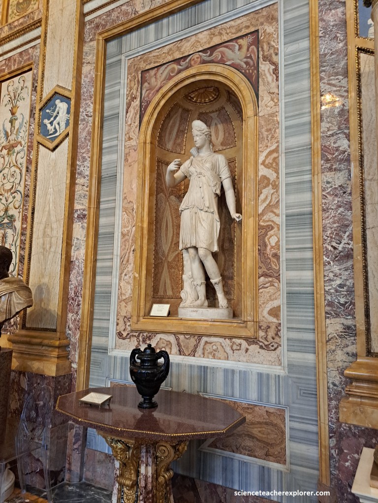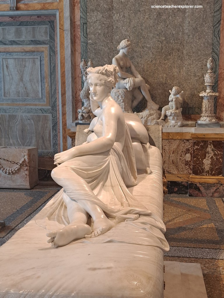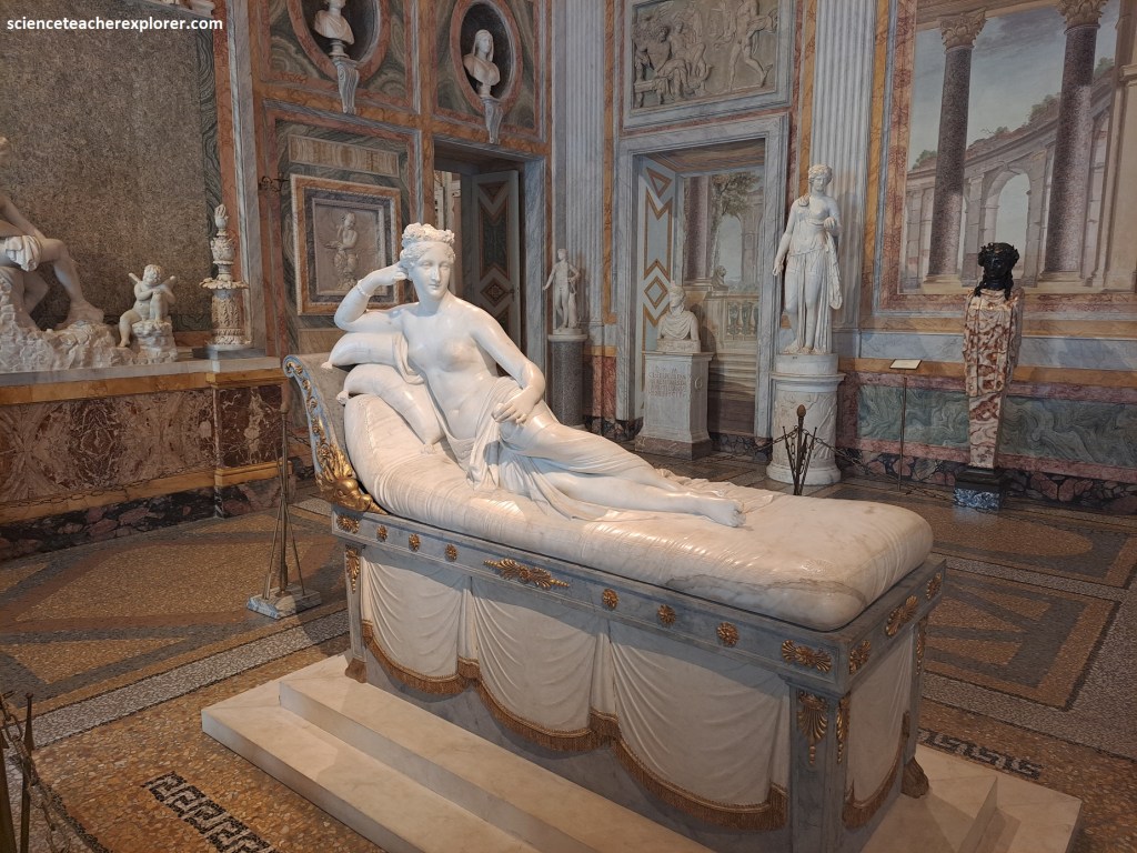 Pictured above, the reclining Pauline Bonaparte, (sister of Napoleon Bonaparte and wife of Camillo Borghese), in the center of room #1, holds an apple in her hand evoking the ‘Venus Victrix’ in the judgement of Paris, who was chosen to settle dispute between Juno (power), Minerva (arts and sciences) and Venus (love). This marble statue of Pauline in a highly refined pose is considered a supreme example of the Neoclassical style.
